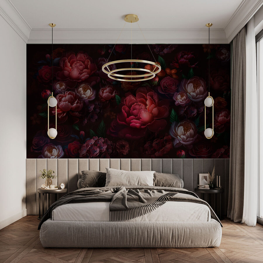 Stap in een wereld waar bloemen nooit vervagen. Deze muurschildering van weelderige bloemen op een donkere achtergrond voelt alsof je een betoverende avondtuin binnenstapt. Stel je de rijke roodtinten en subtiele witten voor die over je muren dansen en elegantie en een vleugje mysterie uitstralen. Perfect om een gewone kamer om te toveren in een weelderig toevluchtsoord. Het is alsof je je eigen persoonlijke bloemenwonderland hebt, zonder dat je groene vingers nodig hebt of vaak water moet geven! Het is chique en tijdloos, ideaal om gezelligheid en charme toe te voegen. Vrienden zullen er misschien verdwalen terwijl ze ernaar staren en nadenken over diepe gedachten of over wat er te eten is.