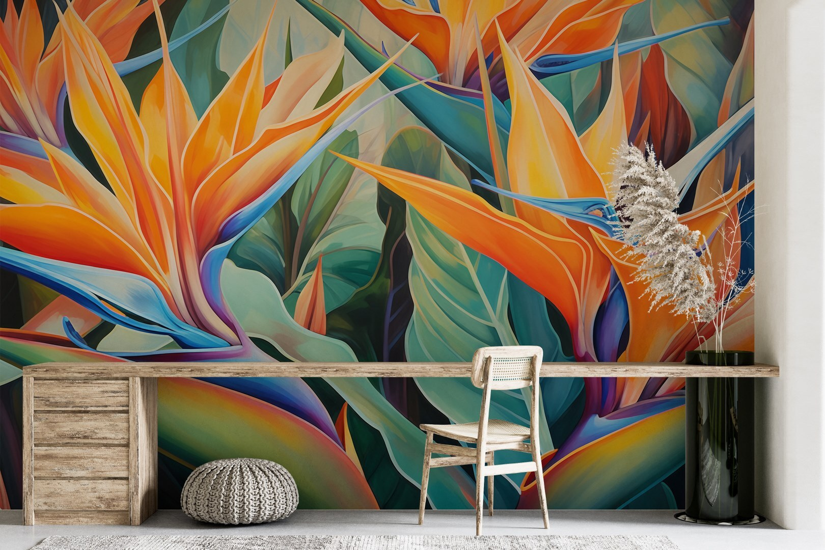 Transformeer je ruimte met de “Bright Blooms” muurschildering, een levendige explosie van kleur die bijna lente uitstraalt. Stel je voor: je loopt een kamer binnen en wordt begroet door de levendige dans van oranje en blauwe bloemen, waarbij elk bloemblaadje geheimen van tropische winden lijkt te verklappen. Het is alsof je een tuin in huis haalt zonder dat je groene vingers nodig hebt of af en toe een gieter.
