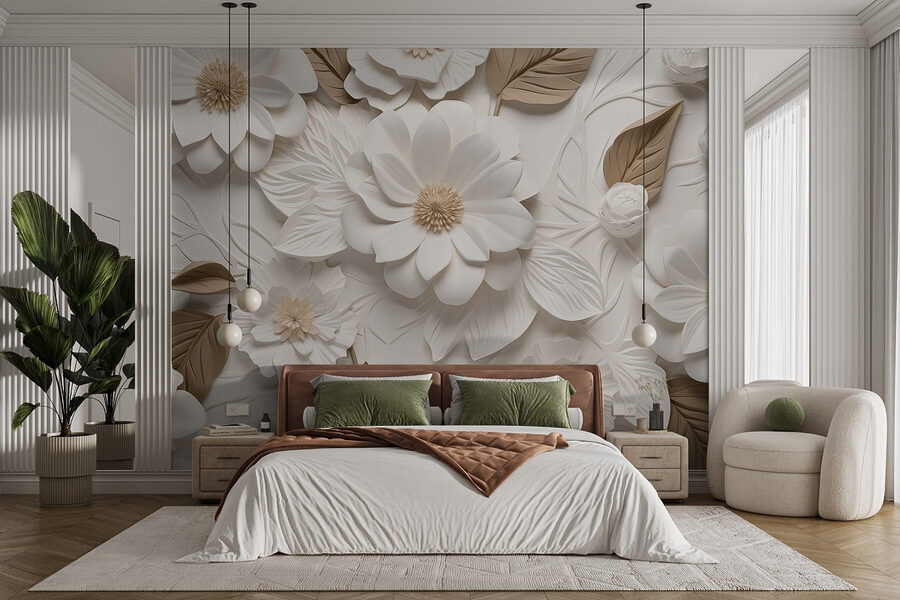 Transformeer elke ruimte met deze prachtige muurschildering met witte en bruine bloemen gewikkeld in delicate bladeren. Stel je eens voor dat je een kamer binnenloopt die direct uitnodigender aanvoelt, alsof de natuur net besloten heeft om zich aan je muren te nestelen! De subtiele tinten creëren een serene sfeer, perfect voor elke omgeving – van een ontspannen slaapkamer tot een levendige woonkamer.