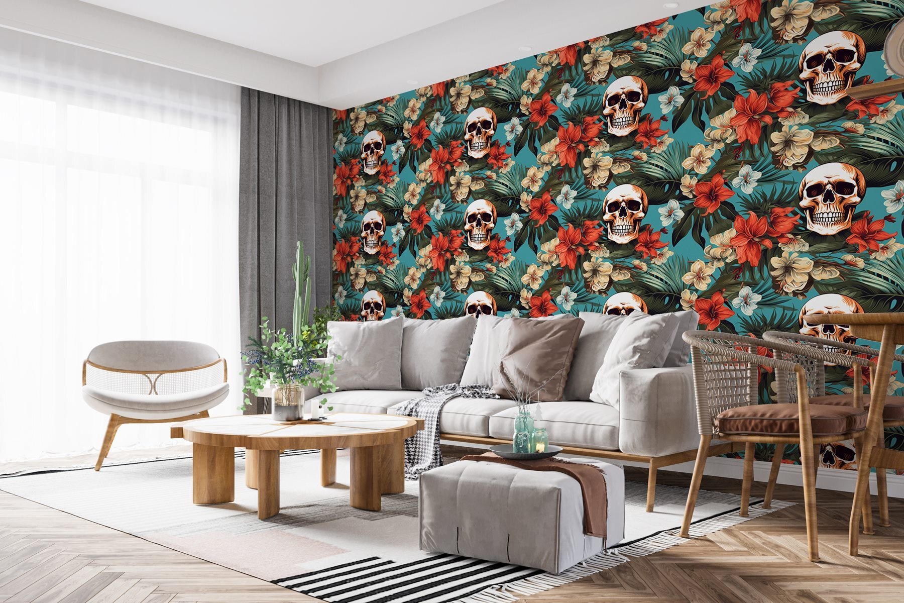 Fleur je ruimte op met deze opvallende muurschildering, waar felle bloemen flirten met schedels in een dans van leven en dood. Het is net een wild tuinfeest dat een beetje… gewaagd is. Stel je voor dat je je kamer binnenloopt en begroet wordt door levendige bloemen, hun kleuren knallen tegen een koele blauwe achtergrond, terwijl die brutale schedels een vleugje intrige toevoegen. Deze muurschildering is niet alleen maar decor; het stimuleert gesprekken, zet je aan het denken en eerlijk gezegd, wie houdt er niet van een beetje speels contrast? Perfect voor mensen met een voorliefde voor unieke, opvallende kunst die een verhaal vertelt – deze muurschildering is een must voor iedereen die wil dat zijn ruimte zowel levendig als gedurfd aanvoelt. Dus laat je muren bloeien (met een twist)!