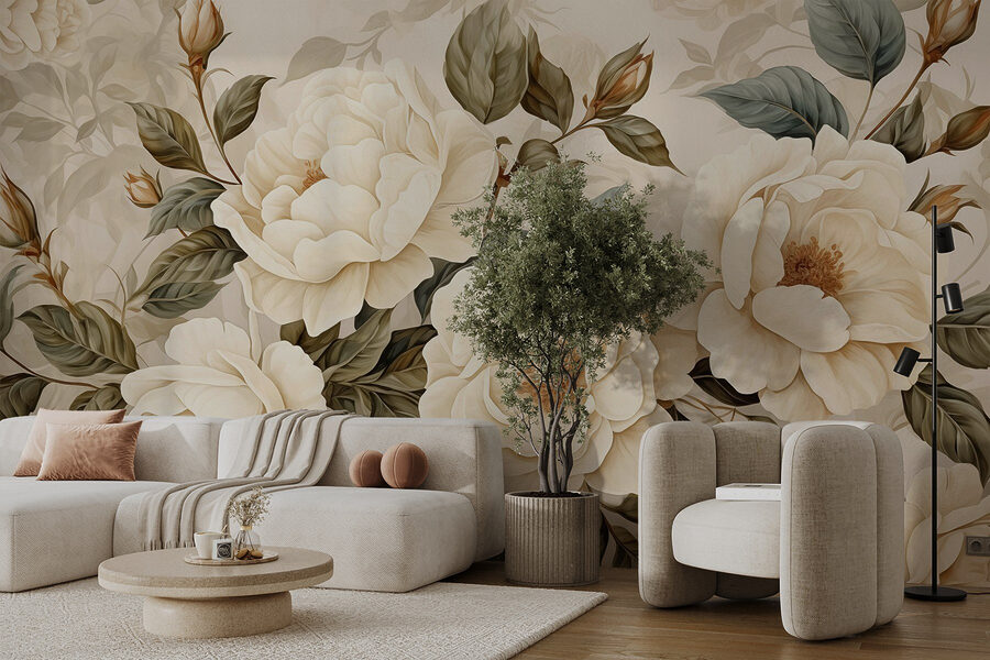 Een kamer omtoveren in een gezellige oase is een koud kunstje met “Delicate Blooms in Soft Tones”. Stel je voor dat je een ruimte binnenstapt waar crèmekleurige pioenrozen moeiteloos op de muren bloeien en je omhullen met zachte tinten die bijna dromerig aanvoelen. Het is alsof je je eigen tuin hebt, zonder de vervelende bijen. Perfect voor dagen waarop je alleen maar thee wilt drinken, een goed boek wilt lezen of wilt dagdromen over een picknick in de lente.