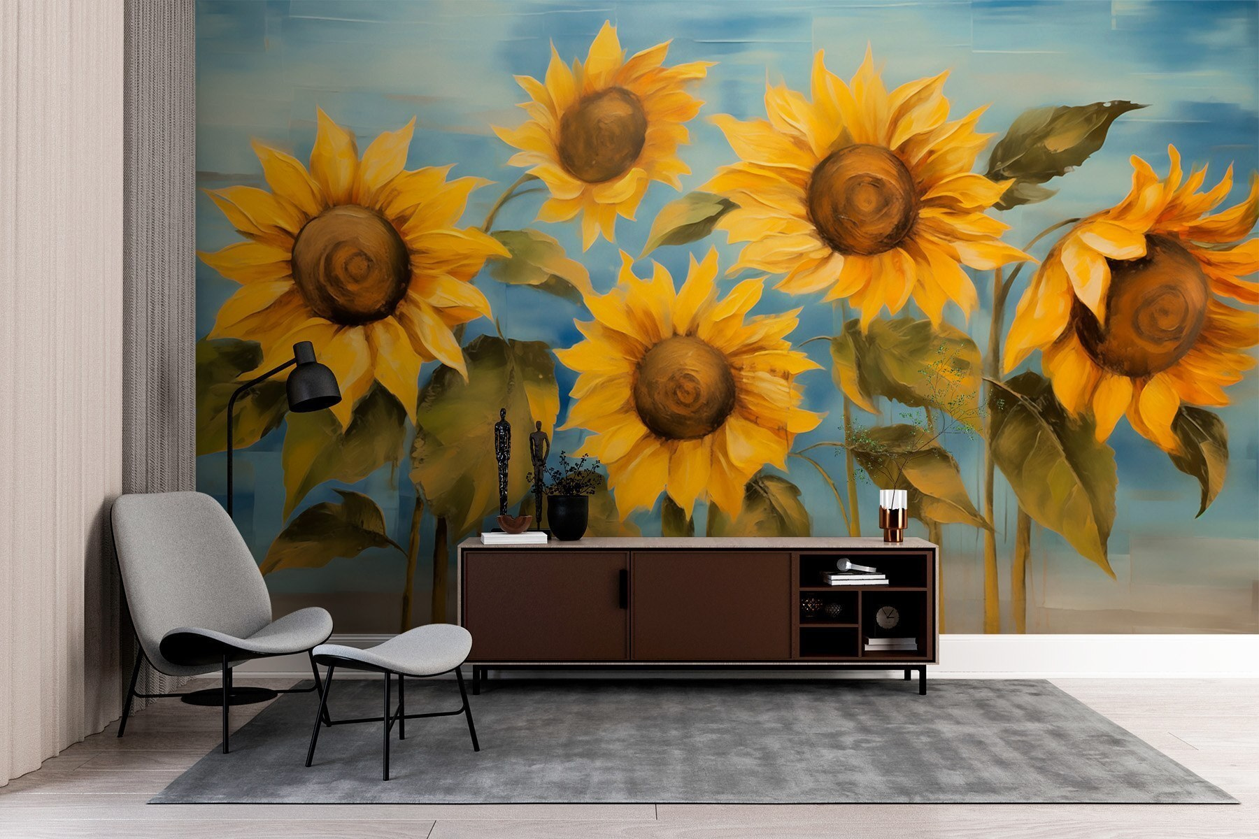 Fleur elke kamer op met deze prachtige muurschildering met vrolijke zonnebloemen die dansen onder een zachtblauwe hemel. Stel je voor dat je na een lange dag thuiskomt en begroet wordt door het levendige geel en het warme groen die vreugde lijken uit te stralen. Het is alsof je een stukje natuur in je woonkamer hebt. Of het nu in een gezellig hoekje is of in een levendige ontmoetingsruimte, de muurschildering nodigt uit tot glimlachen en warmte. Stel je voor dat vrienden aan het kletsen zijn of kinderen aan het spelen zijn, terwijl deze prachtige bloemen de wacht houden. Een perfecte manier om een vleugje kleur toe te voegen en het buitenleven naar binnen te halen!