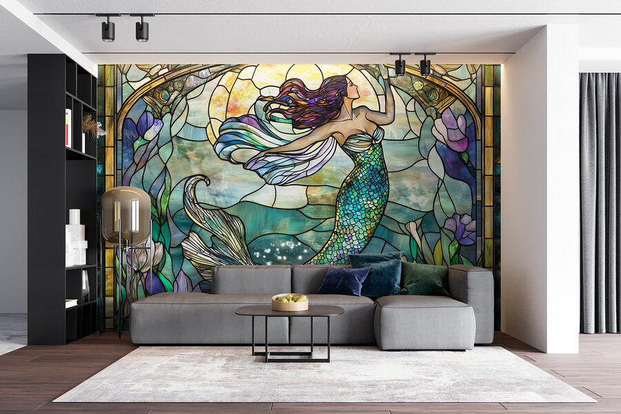 Duik in een kleurrijke onderwaterwereld met deze muurschildering met een prachtig gebrandschilderd raamontwerp van een zeemeermin. Stel je voor dat je ‘s ochtends aan je koffie nipt terwijl je geniet van de vrolijke tinten oceaanblauw en -groen die over je muren stromen. De delicate wervelingen en vloeiende lijnen creëren een gevoel van rust dat elke ruimte verzacht. Stel je gezellige filmavonden met vrienden voor, waar iedereen wordt aangetrokken door de magische charme van de zeemeermin. Deze muurschildering versiert niet alleen een kamer, maar nodigt ook uit tot verhalen, dagdromen en een vleugje eigenzinnigheid in het dagelijks leven. Perfect voor natuurliefhebbers of iedereen die een vleugje zee in huis wil.