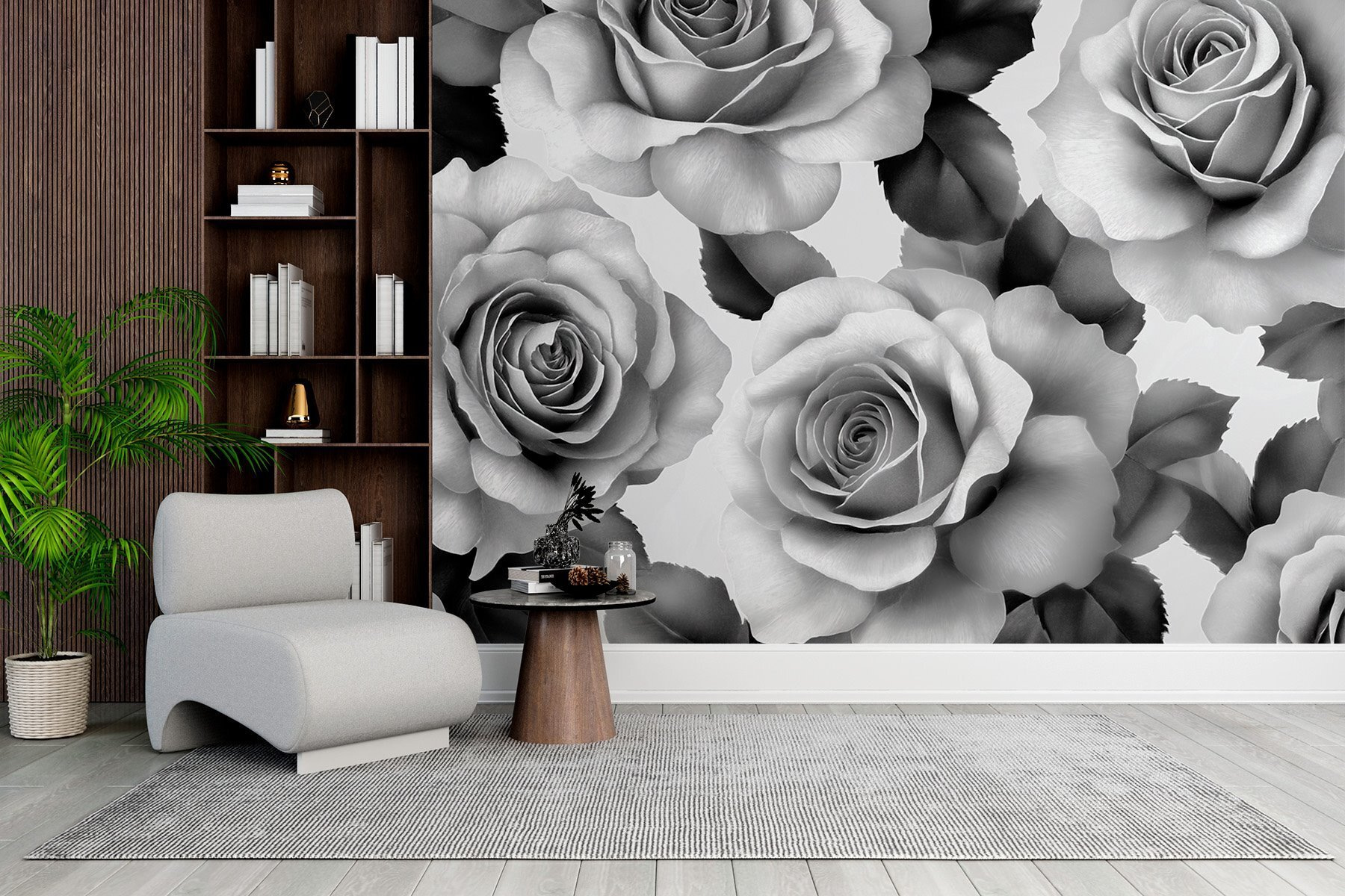 Tover je ruimte om in een bloemenwonderland met deze prachtige muurschildering met een groep elegante rozen en weelderige bladeren. Het is niet zomaar een decoratie; het is alsof je een tuin aan je muur hebt die nooit verwelkt! Stel je voor: je leunt achterover met een kopje thee en deze rijke, zwart-witte rozen omringen je en voegen een vleugje verfijning en sereniteit toe. Perfect voor een gezellige leeshoek of een chique eethoek, het nodigt uit tot warmte en gesprek. Of het zonlicht nu over de bloemblaadjes danst of het maanlicht zachte schaduwen werpt, deze muurschildering zorgt ervoor dat elk moment bijzonder aanvoelt. Je muren zullen het gesprek van de dag zijn – wie had gedacht dat de natuur zo stijlvol kon zijn?