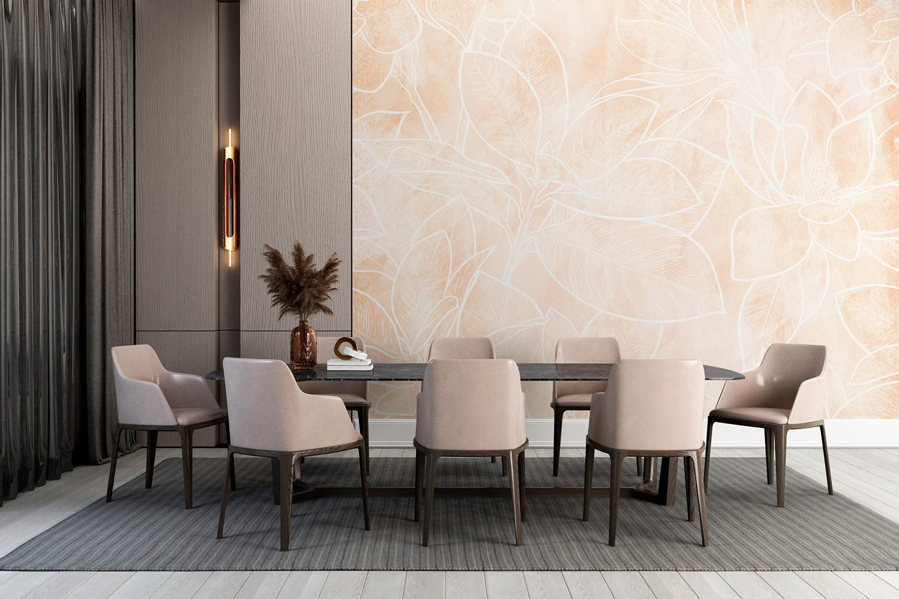 Transformeer elke kamer met deze prachtige muurschildering met een delicate witte lijntekening van bloemen. Het is alsof je een zachte lentebries in huis haalt. De zachte tinten en ingewikkelde ontwerpen versieren niet alleen een muur, maar brengen warmte en een vleugje natuur in huis. Stel je voor dat je koffie drinkt in een ruimte die zowel rustgevend als opbeurend aanvoelt. Perfect voor een gezellig hoekje of een opvallende muur, het is ook een conversatiestarter – wie houdt er niet van een beetje bloemige charme? Je muren zullen je dankbaar zijn!