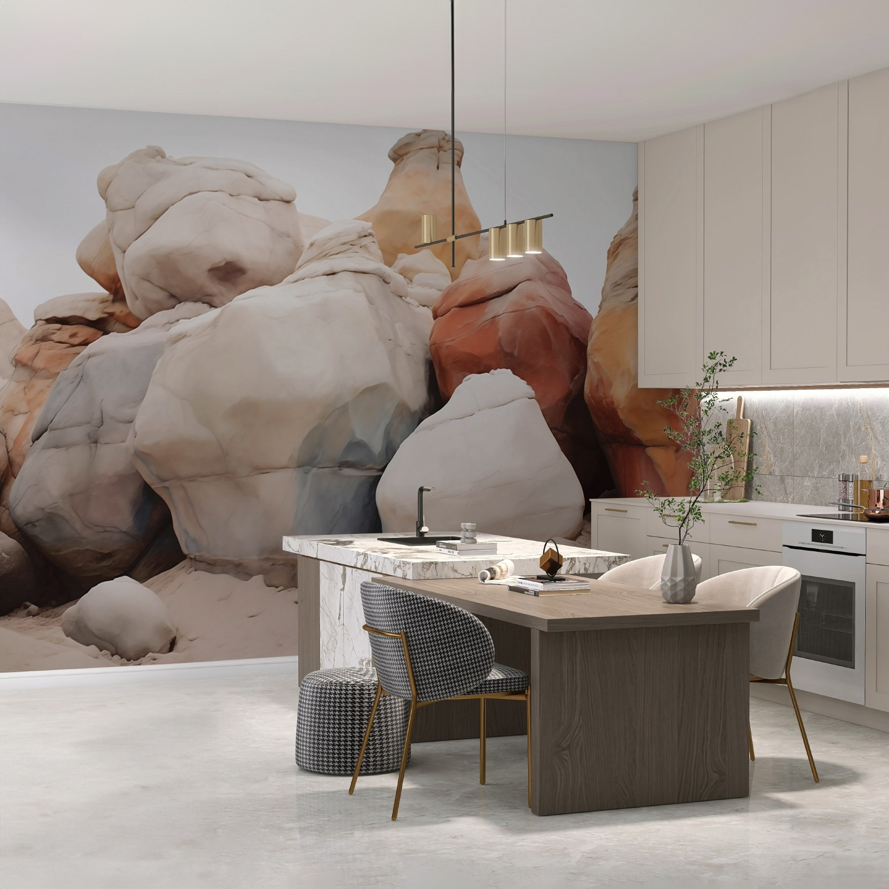 Transformeer je ruimte met deze prachtige muurschildering met een groep grote rotsen genesteld in een zachte, zanderige omgeving. Het is alsof je een stukje natuur in huis haalt, wat doet denken aan luie stranddagen en het rustgevende geluid van golven. De zachte tinten van de rotsen voegen warmte toe, terwijl die zanderige tinten zorgen voor een o-zo-gezellig gevoel. Stel je voor dat je lekker in je woonkamer ligt, nippend aan een drankje en verdwaald in de schoonheid van dit serene landschap. Het is niet alleen decor; het nodigt uit tot dagdromen en herinnert je aan rustige momenten in de natuur. Deze muurschildering is perfect om een ontspannen sfeer te creëren en laat je vrienden denken dat je ergens een geheim stranduitstapje verborgen hebt. Laat die vibes maar komen!