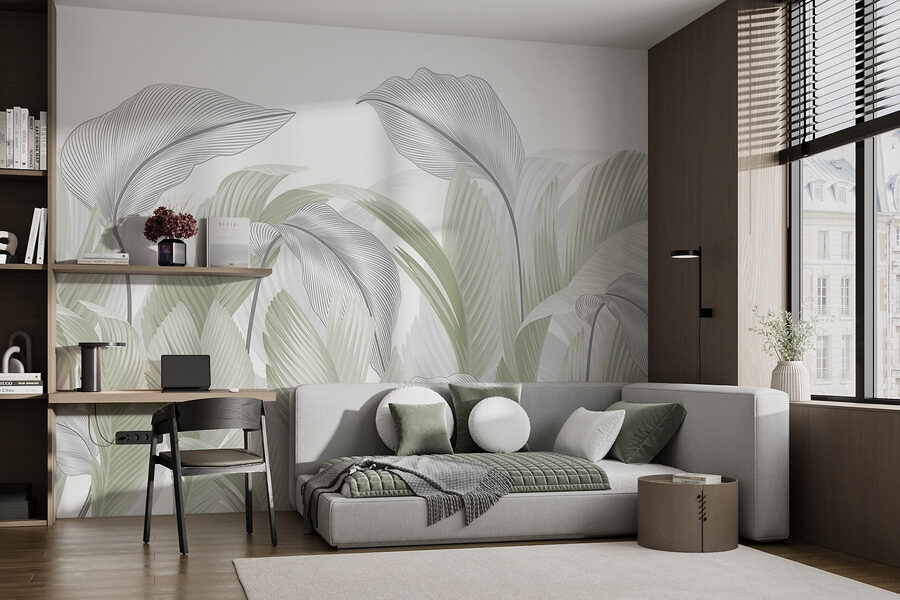 Tover elke ruimte om in een oase van rust met deze prachtige muurschildering, “Zachte rondingen van bladrijke elegantie”. Stel je voor dat je vanuit je woonkamer een vredig toevluchtsoord binnenstapt – deze prachtig geschetste palmbladeren dansen sierlijk en voegen een vleugje natuurlijke charme toe aan je muren. De zachte groentinten en ingewikkelde lijnen passen moeiteloos bij elkaar, waardoor de kamer opener en luchtiger aanvoelt. Stel je voor dat je lekker wegkruipt met een boek, terwijl de bladeren zachtjes hun kalme vibraties fluisteren. Het is alsof je een stukje van een serene tuin thuis hebt. Wie heeft er vakantie nodig als je muur al het zware werk doet?