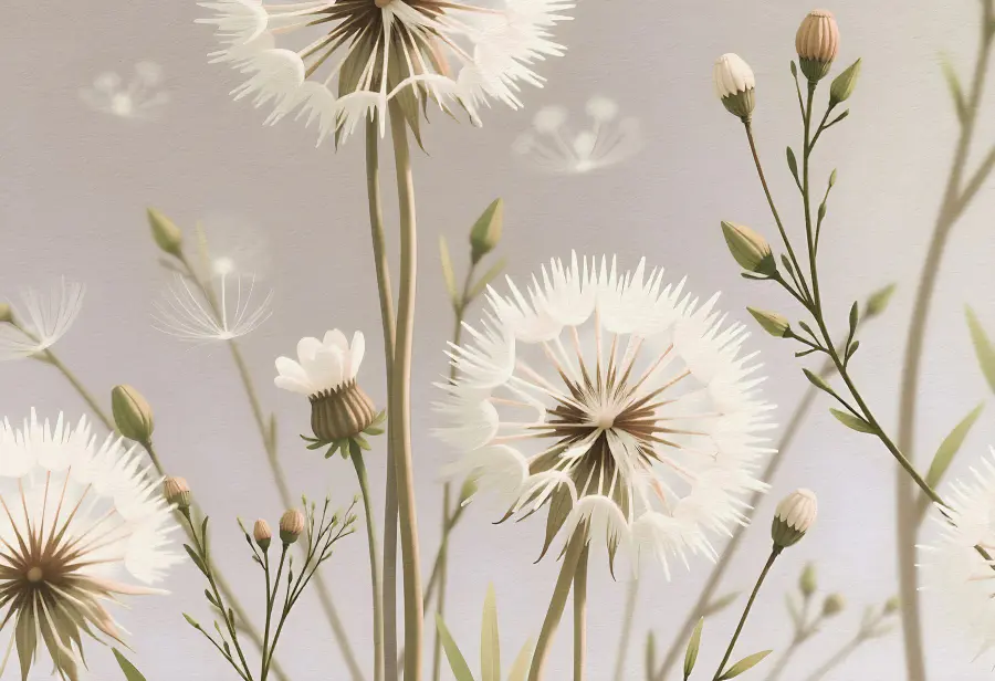 Transformeer je ruimte met de muurschildering “Delicate Blooms in Soft Palette”. Dit prachtige ontwerp brengt een vleugje natuur binnenshuis, met mooie paardenbloemen en zachte bloemen. Stel je voor dat je wakker wordt en begroet wordt door dit rustgevende kunstwerk – het is als een zacht gefluister uit de tuin!
