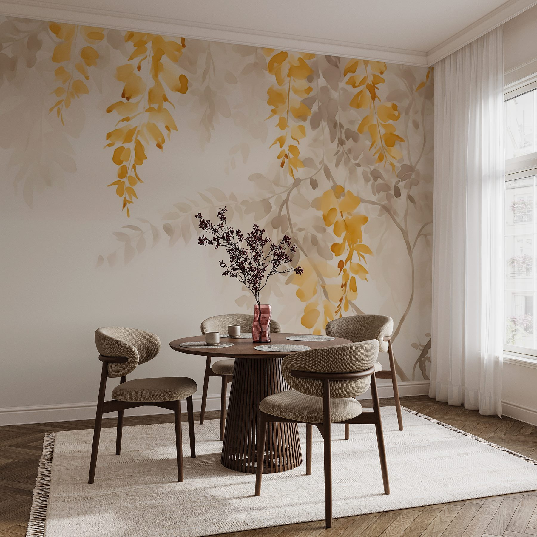 Transformeer je ruimte met deze prachtige muurschildering met gele en grijze bladeren op een frisse witte achtergrond. Het is net alsof je een frisse wind in huis haalt – tuinieren is niet nodig! Stel je voor dat je ‘s ochtends aan je koffie nipt omringd door de zachte tinten van de natuur, echt, hoe rustgevend is dat?