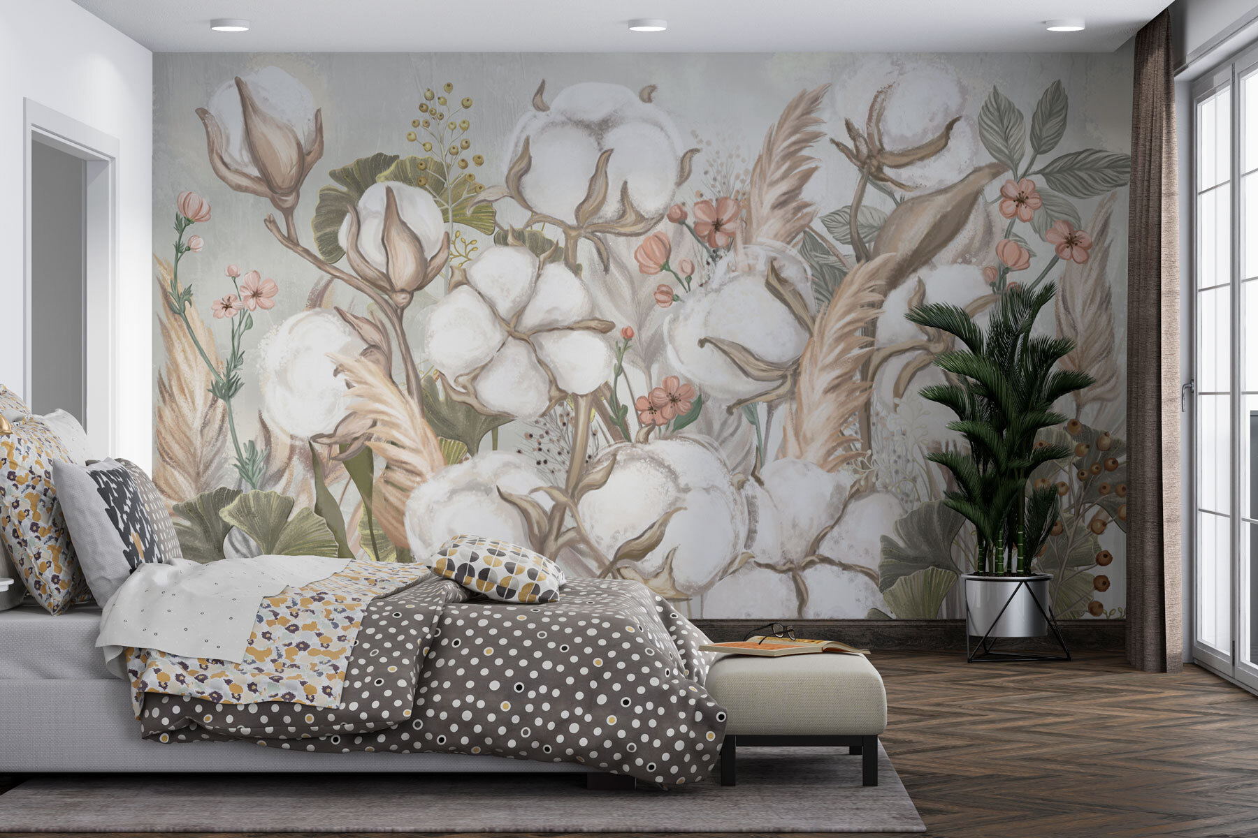 Transformeer je muren met de dromerige muurschildering “Fluffy Cotton Blooms in Soft Hues”. Stel je voor dat je een serene tuin binnenstapt waar de zachtheid van katoenen bloemen zoete woordjes fluistert. Dit ontwerp is een zachte herinnering aan de schoonheid van de natuur, perfect om een gezellige sfeer te creëren. De subtiele groentinten en warme neutrale tinten geven het hele jaar door een lentegevoel – wie wil dat nu niet? Zie het voor je in een kinderkamer of misschien in een ontspannend leeshoekje. Kun je de frisse lucht al bijna ruiken? Deze muurschildering decoreert niet alleen, maar nodigt uit om even stil te staan, adem te halen en te genieten van de schoonheid om je heen. Geloof ons, zelfs je muur zal je dankbaar zijn!