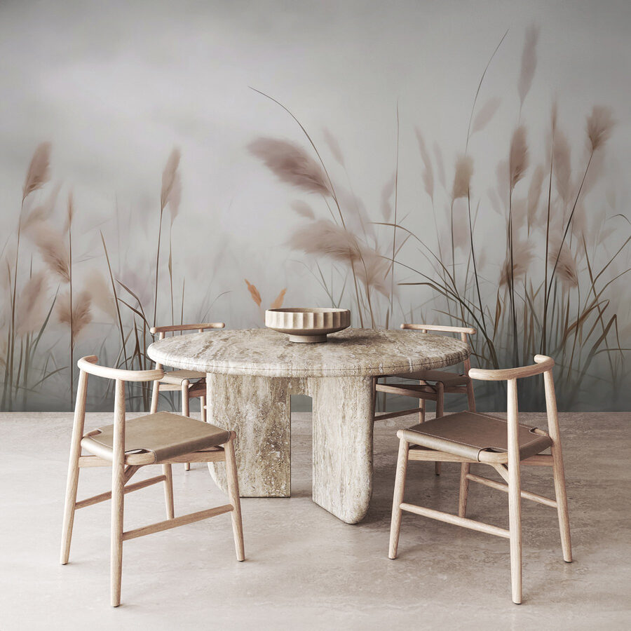 Stel je dit eens voor: zachte grassen die zachtjes wiegen in een mistig landschap en geheimen fluisteren van de stille schoonheid van de natuur. Deze muurschildering omhult je muur in een gezellige omhelzing en brengt een stukje serene buitenwereld bij je thuis. Stel je voor dat je aan je ochtendkoffie nipt terwijl dromerige mistflarden een rustige achtergrond creëren. Het voelt alsof je een kalme, betoverde tuin binnenstapt – perfect voor dagdromen of die diepe gedachten over de mysteries van het leven, toch? Met zijn warme tinten en delicate details is het net alsof je je persoonlijke natuurvlucht hebt zonder de bank te verlaten. Serieus, wie heeft een vakantie nodig als je muur het werk kan doen?