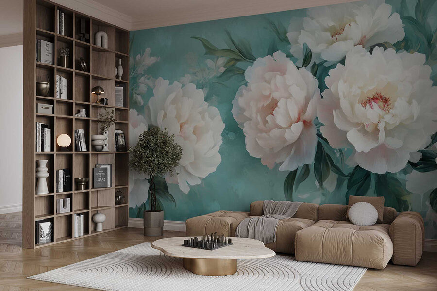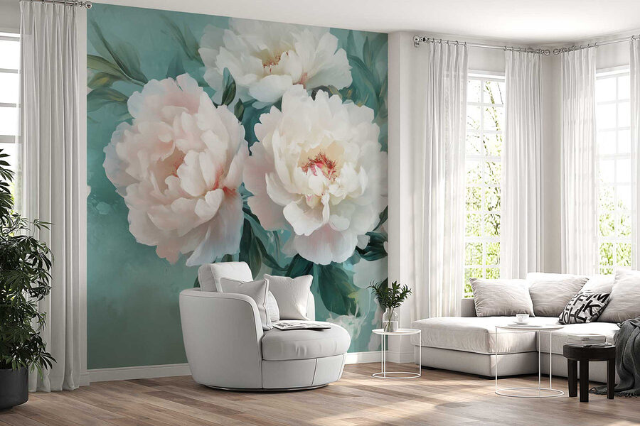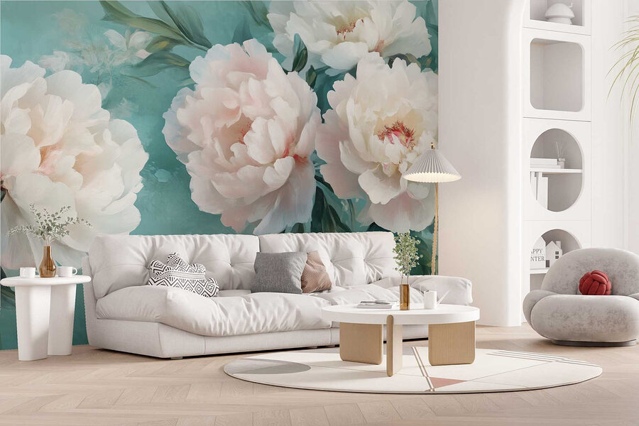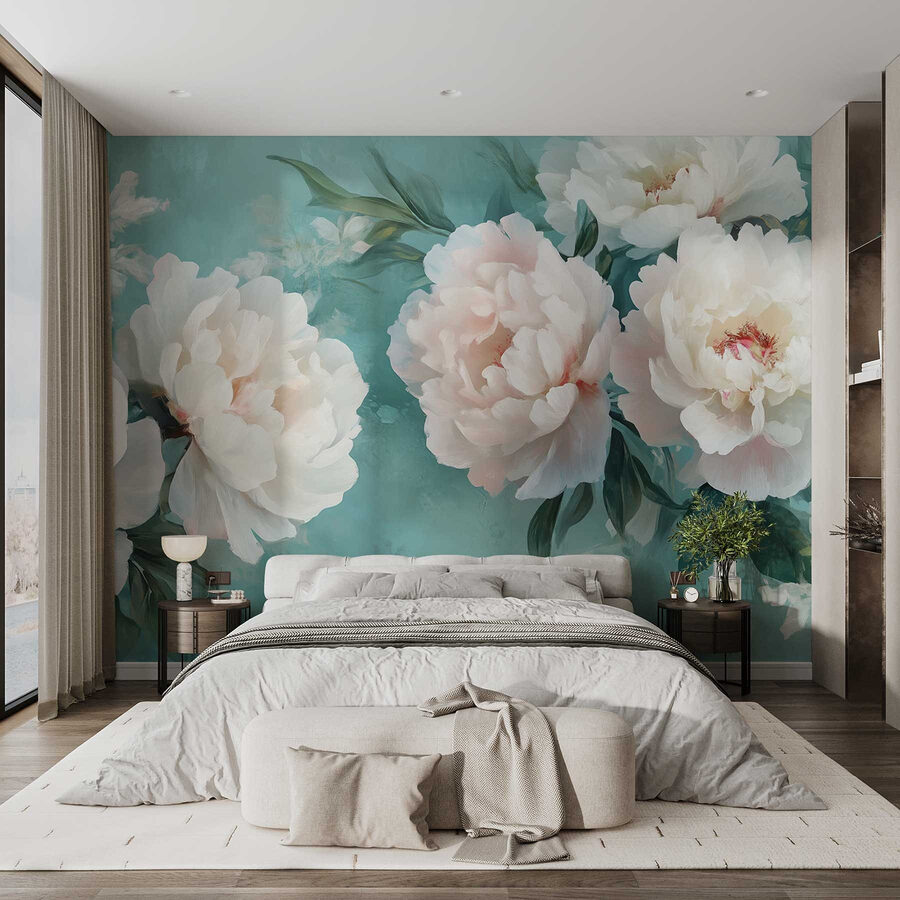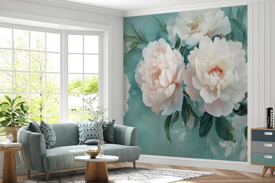 Fleur die lege muren op met deze prachtige muurschildering van witte pioenrozen, perfect voor iedereen die een beetje bloemenmagie in zijn of haar ruimte wil. Stel je voor dat je een kamer binnenloopt die aanvoelt als een tuin in volle bloei – zachte bloemblaadjes die erom smeken bewonderd te worden. De zachte turquoise tinten doen je denken aan een zomerse hemel, waardoor zelfs de meest regenachtige dag aanvoelt als een briesje. Wie zou er niet graag koffie drinken omringd door deze schoonheden? Het is alsof je een beetje natuur in huis haalt, zonder dat je groene vingers nodig hebt. Geloof me, deze muurschildering zal sneller complimenten krijgen dan een zonnebloem in een veld!