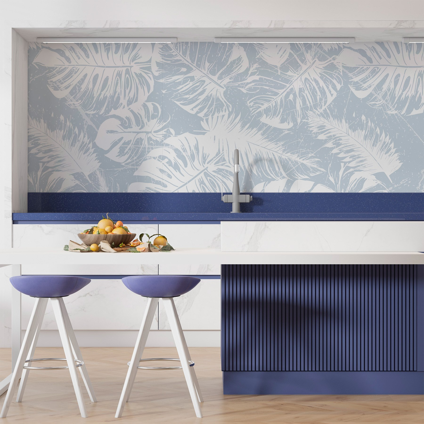 Verander elke kamer in een serene ontsnapping met deze betoverende muurschildering met witte bladeren tegen een zachtblauwe achtergrond. Stel je voor dat je je leefruimte binnenloopt en het voelt alsof je in een rustige tropische oase stapt, zonder de vochtigheid en vervelende muggen. De eenvoud van het ontwerp doet denken aan luie middagen met een koel drankje in de hand. Het is perfect om een ontspannen sfeer te creëren, of het nu in een gezellige leeshoek is of in een levendige eethoek. Bovendien voegt het een vleugje natuur toe zonder dat je er iets aan hoeft te doen – water geven is niet nodig! Gewoon pure gelukzaligheid op de muren. Of je gasten nu genieten van het landschap of dat je zelf langskomt met de was, het zal zeker een glimlach op je gezicht toveren en misschien zelfs een beetje dagdromen.