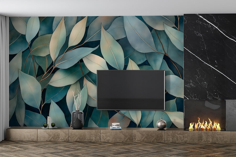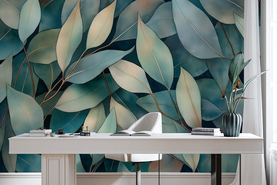 Haal een frisse wind in huis met deze prachtige muurschildering met een weelderige groep bladeren op een rustgevende blauwe achtergrond. Stel je voor dat je wakker wordt en koffie drinkt terwijl je omringd wordt door deze serene vleugje natuur. Het is alsof je een mini-regenwoud in je woonkamer hebt. Perfect voor wie een beetje groen wil, maar geen groene vingers heeft. Elk blad lijkt te dansen en nodigt uit tot een gevoel van rust en eigenzinnigheid. Of het nu in een gezellige leeshoek is of in een levendige keuken, deze muurschildering zet de juiste sfeer neer – laten we zeggen, het is een gespreksstarter!