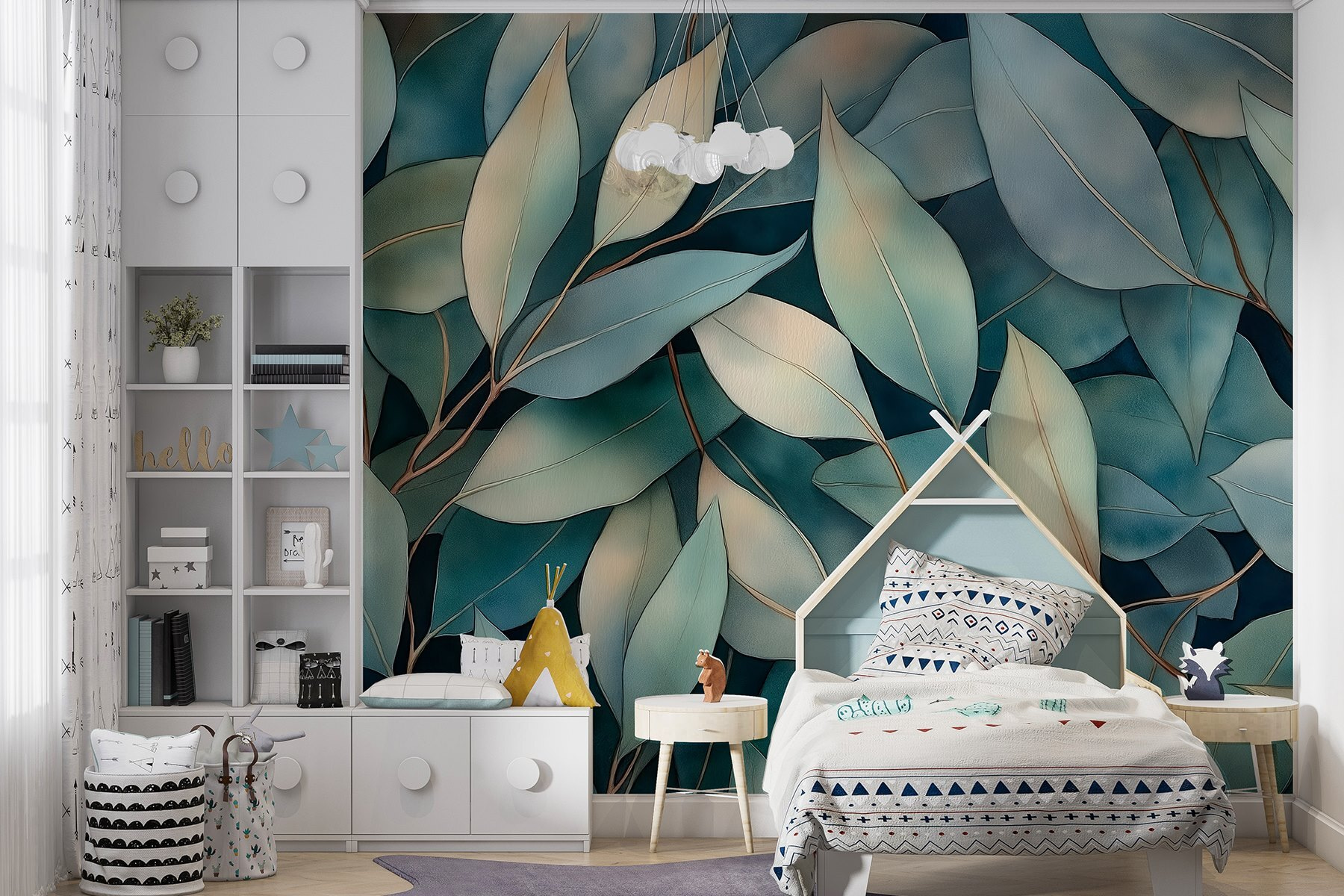 Haal een frisse wind in huis met deze prachtige muurschildering met een weelderige groep bladeren op een rustgevende blauwe achtergrond. Stel je voor dat je wakker wordt en koffie drinkt terwijl je omringd wordt door deze serene vleugje natuur. Het is alsof je een mini-regenwoud in je woonkamer hebt. Perfect voor wie een beetje groen wil, maar geen groene vingers heeft. Elk blad lijkt te dansen en nodigt uit tot een gevoel van rust en eigenzinnigheid. Of het nu in een gezellige leeshoek is of in een levendige keuken, deze muurschildering zet de juiste sfeer neer – laten we zeggen, het is een gespreksstarter!