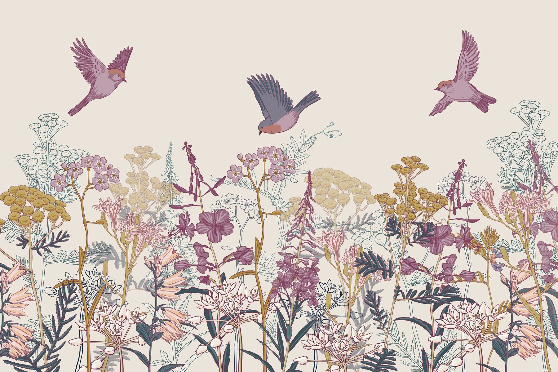 Fotobehang Vogels vliegen over bloemen (SKU: w03102)