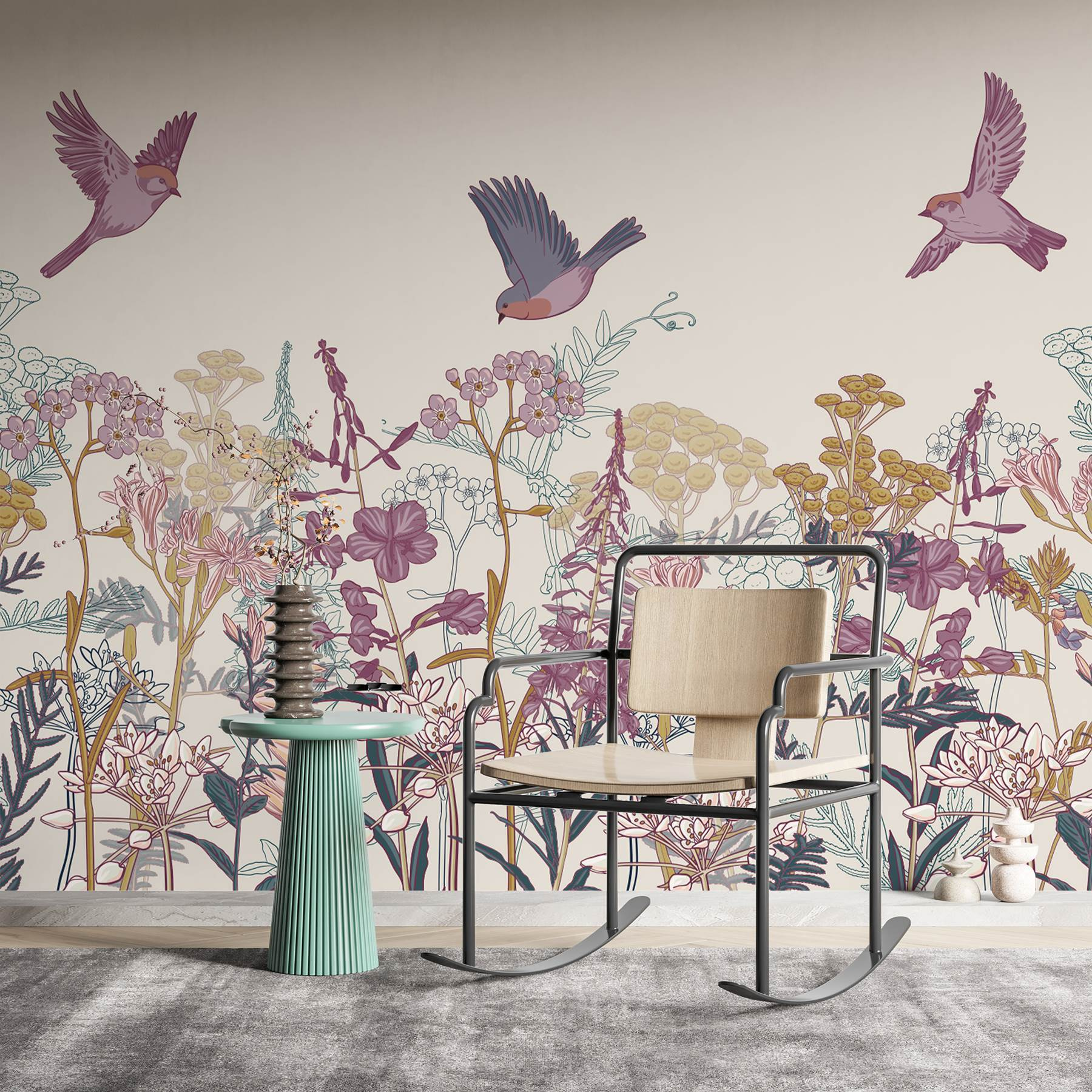 Fotobehang Vogels vliegen over bloemen Fotobehang Vogels vliegen over bloemen
