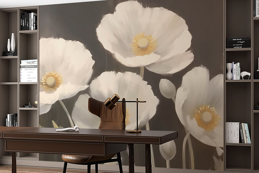 Maak je klaar om een vleugje natuur in huis te halen met deze prachtige muurschildering met delicate witte bloemen. Het is alsof je door een serene tuin wandelt telkens wanneer je de kamer binnenstapt. De zachte, gedempte tinten in combinatie met die vrolijke gele accenten in het midden van elke bloem? Oh, ze zijn gewoonweg prachtig! Stel je voor dat je ‘s ochtends van je koffie nipt terwijl je geniet van de gloed van deze schoonheden. Het is niet alleen decoratie, het is ook een gespreksonderwerp. Vrienden zullen zich afvragen of je een schilder hebt ingehuurd of dat je op magische wijze ‘s nachts een bloemenmuur hebt gekweekt. Perfect om elke ruimte rustig en uitnodigend te maken!
