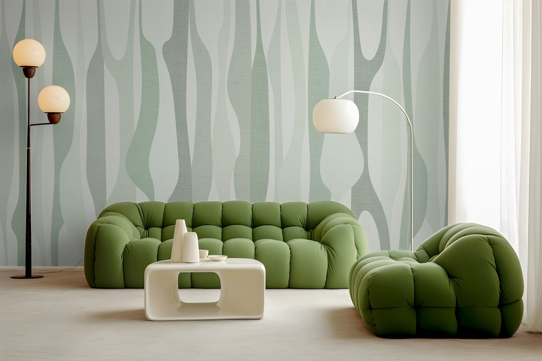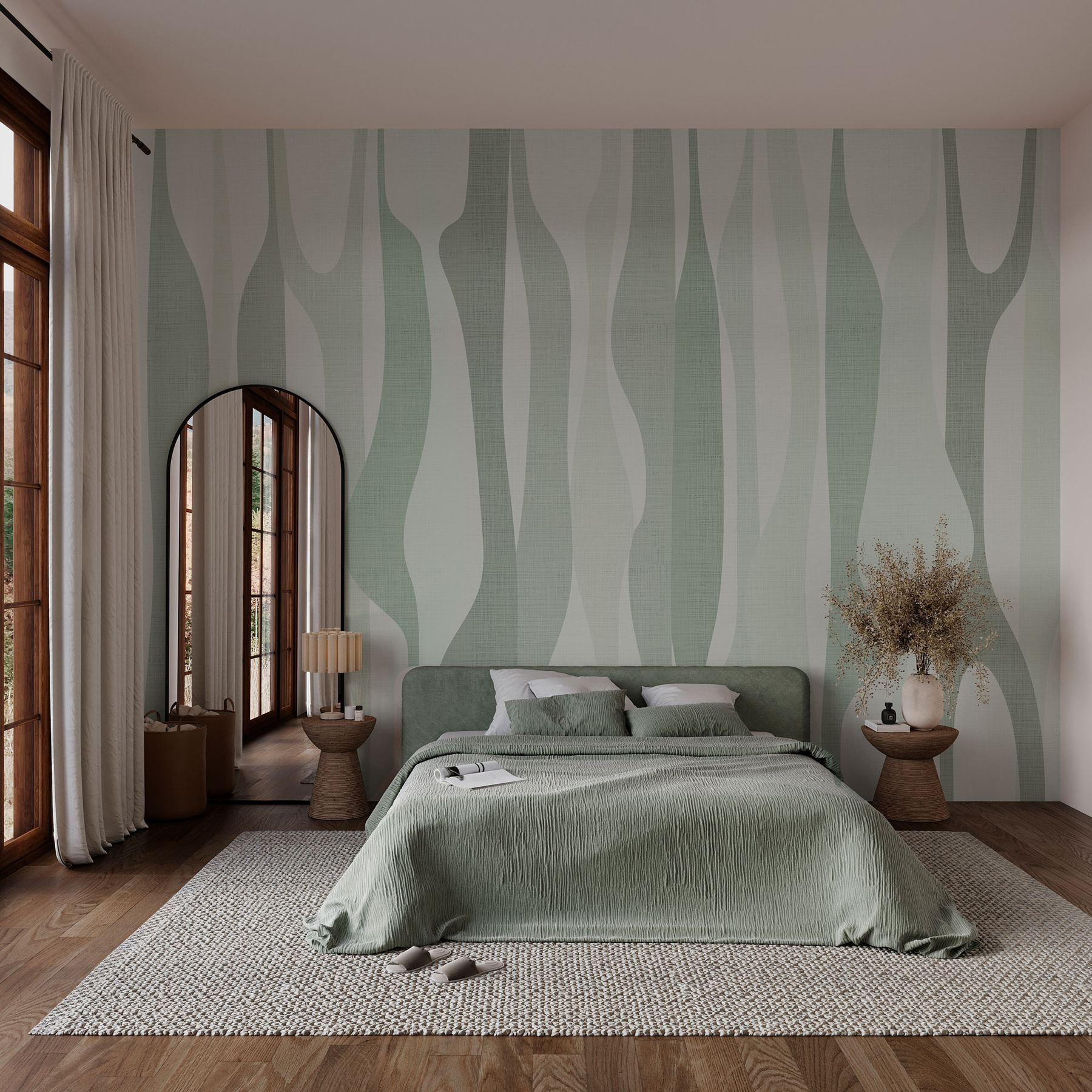 Transformeer elke kamer met deze Fotobehang Abstract golvend patroon in zachte kleuren. Stel je voor: je loopt een ruimte binnen en bam! Die zachte golven van mintgroen en zacht grijs wikkelen zich om je heen als een warme knuffel. Het is perfect om een rustige, ontspannen sfeer te creëren – ideaal voor een gezellige leeshoek of dat hoekje waar je ‘s ochtends aan je koffie nipt. Stel je voor dat je daar zit, het zonlicht dat naar binnen schijnt en de muurschildering die zoete woordjes over rust fluistert. Perfect voor wie van de natuur houdt zonder de rommel van planten, brengt dit stuk een beetje van het buitenleven naar binnen en maakt tegelijkertijd een stijlvol statement. Echt een oase voor de ogen!