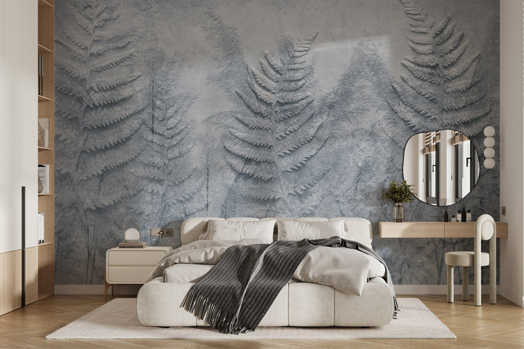 Transformeer je ruimte met de muurschildering “Group of Fern Leaves”, waar natuur en kunst in perfecte harmonie samen dansen. Stel je voor dat je een sereen bos binnenstapt, omringd door delicate varenbladeren die zachtjes wiegen in de wind. Deze muurschildering omhult je kamer in een kalmerende omhelzing en brengt je meteen in een hogere stemming. Het is alsof je een stukje buiten naar binnen haalt zonder dat je je zorgen hoeft te maken over modderige schoenen. Stel je gezellige ochtenden voor met koffie in de hand, waarbij je je geïnspireerd voelt door alleen maar naar je muur te kijken. Het is niet alleen decor; het is een kleine herinnering aan de schoonheid van de natuur, die op subtiele wijze rust brengt in het dagelijks leven. Een perfect accent om elke kamer een beetje gezelliger te maken.