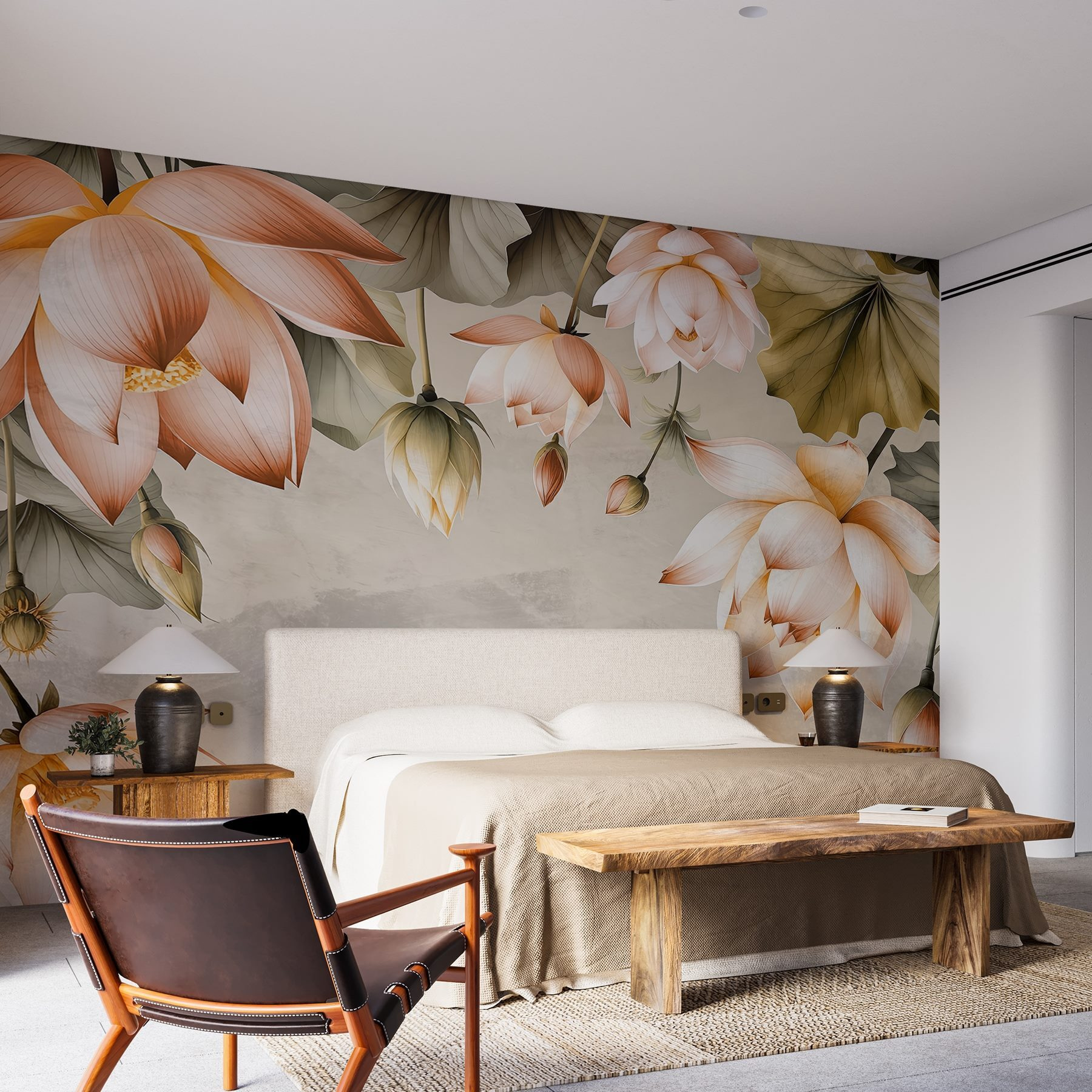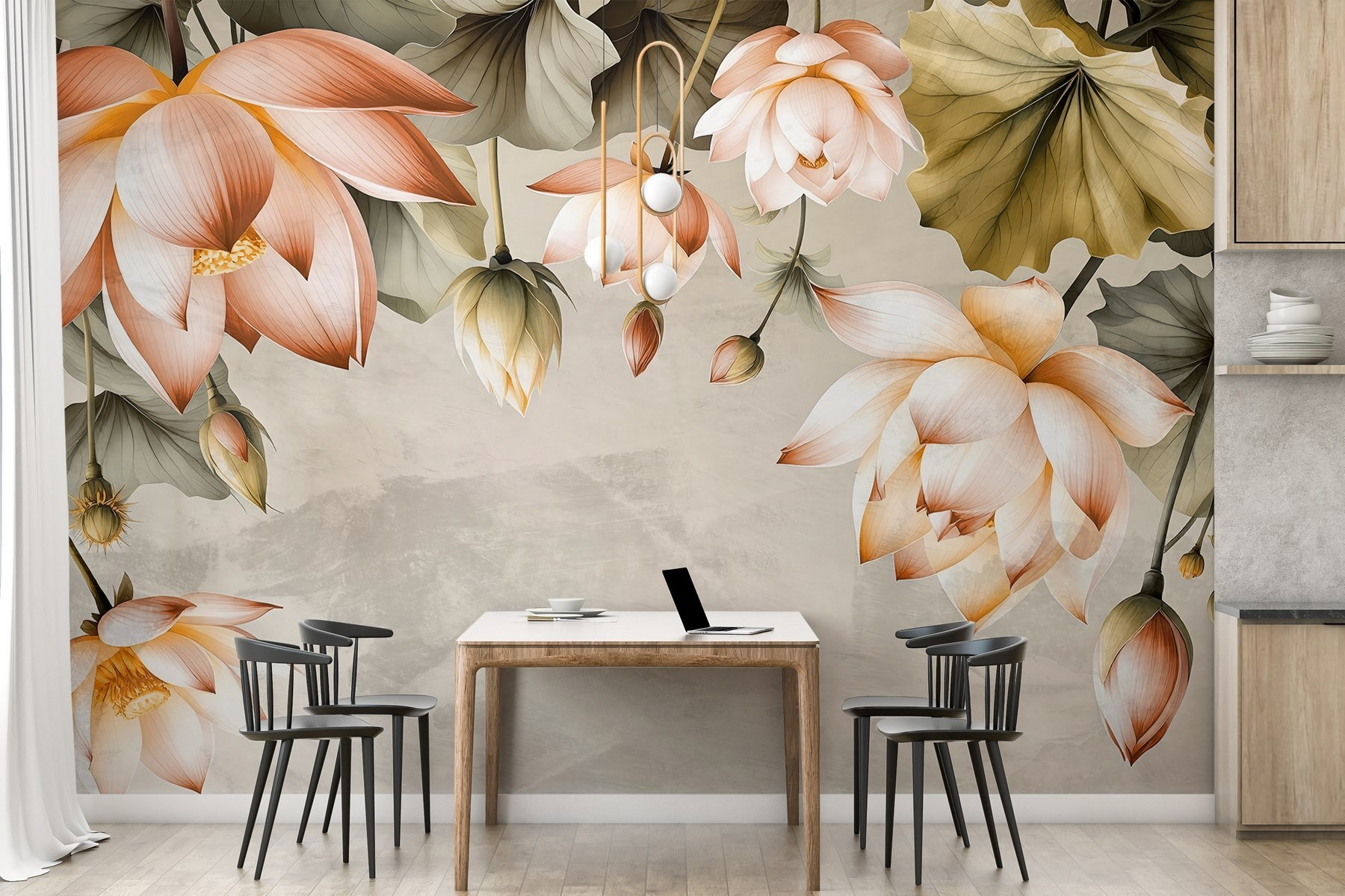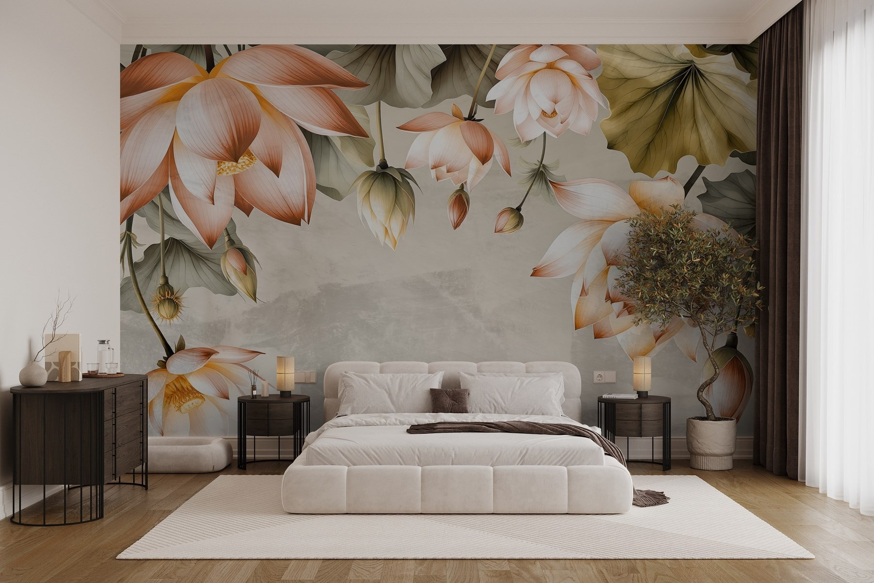 Verander je ruimte in een serene oase met deze prachtige muurschildering met delicate bloemen in zachte tinten. De prachtige bloesems lijken sierlijk over je muur te dansen en creëren een rustgevende sfeer die de stemming direct verlicht. Stel je voor dat je ‘s ochtends aan je koffie nipt, omringd door de kalme, zachte aanwezigheid van deze bloemen – perfect voor elke kamer die wel wat liefde kan gebruiken. Elk bloemblaadje en blaadje fluistert warmte, waardoor het voelt als een wandeling door een zonnige tuin, zelfs op de grijsste dagen. Wat is er mooier dan die weldadige natuur in huis te halen? Het is niet zomaar decoratie; het is een stukje natuur bij je thuis.
