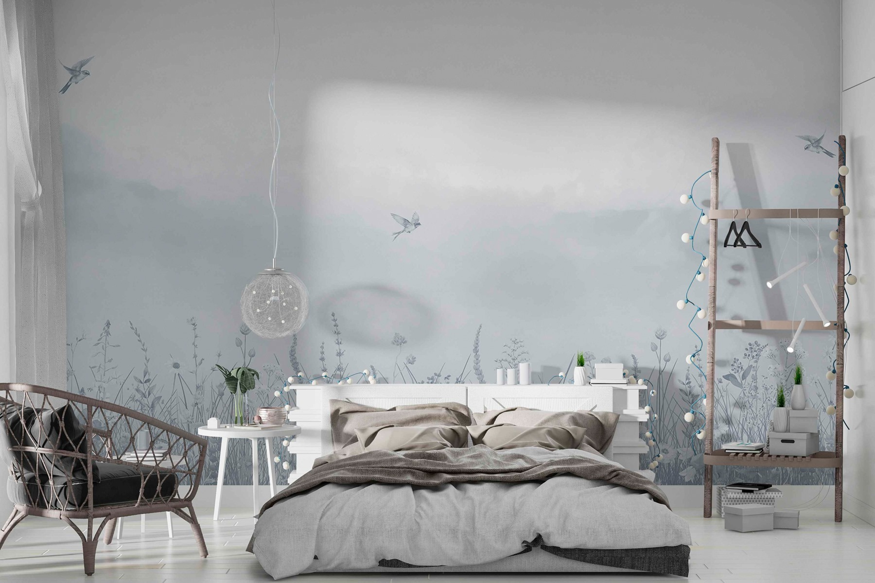 Maak van elke kamer een rustige plek met deze muurschildering van een vogel die sierlijk over een bloemenveld zweeft. Stel je voor dat je wakker wordt met deze zachte scène – heldere bloemen onder een eindeloze hemel, die een sfeer uitstraalt die “vredige dagdromen” zegt. Het is niet alleen decor; het geeft vreugde, een beetje reislust en misschien een vleugje nostalgie naar luie middagen in de buitenlucht.