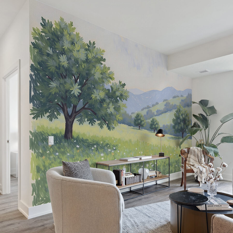 Verander elke kamer in een serene ontsnapping met deze prachtige muurschildering met een schilderachtig landschap van glooiende heuvels en vrolijke bomen. Stel je voor dat je naar dit tafereel staart en die zachte bries voelt, je hoort bijna het gefluister van de natuur. Het is net een stukje platteland in je huis. Combineer het met wat knusse kleedjes en zachte verlichting en je hebt een perfecte plek om tot rust te komen na een lange dag. Serieus, wie heeft een vakantie nodig als je deze rustgevende sfeer thuis kunt hebben? Het is een kleine verandering met een enorme impact!