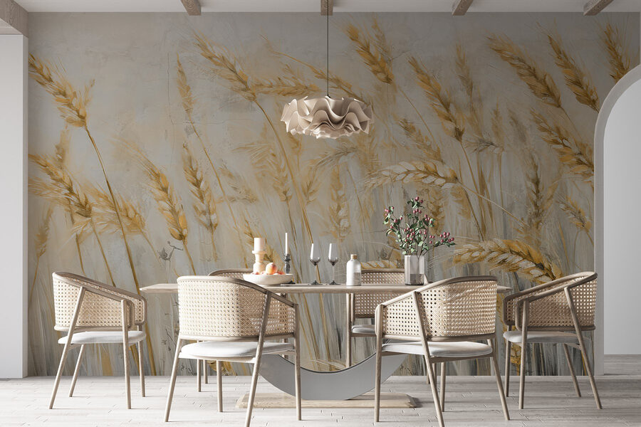 Transformeer je ruimte met een prachtige muurschildering van een tarweveld dat zachtjes wiegt in de wind. Dit stuk voegt een vleugje natuurlijke schoonheid toe en brengt een warme, aardse sfeer in elke kamer. Stel je voor dat je ‘s ochtends aan je koffie nipt en het gevoel hebt dat je in een eindeloos gouden veld staat, met de zon die je wangen kust. Het is het soort muurschildering dat muren levendig maakt en dagdromen van picknicks en luie middagen opwekt. Perfect voor een gezellige woonkamer of een serene slaapkamer, deze muurschildering nodigt uit tot een gevoel van rust en vreugde en herinnert iedereen eraan dat de natuur slechts een oogopslag verwijderd is.