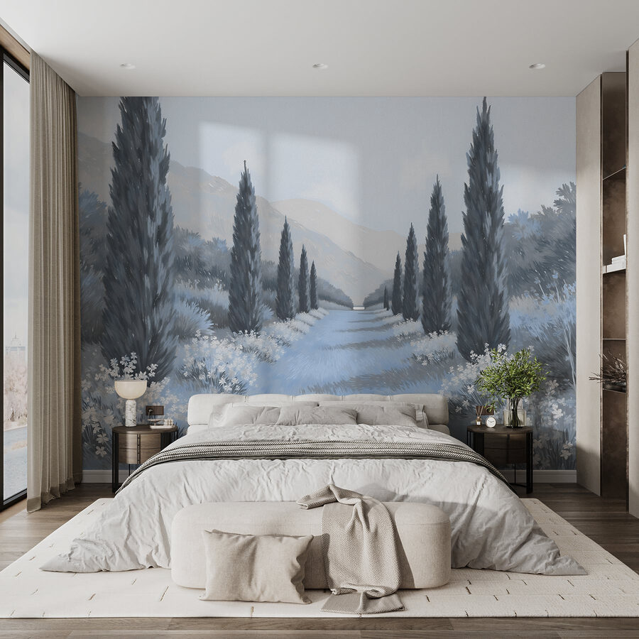 Transformeer je ruimte met deze fascinerende muurschildering, “Landschap met bomen en bloemen”. Stel je een sereen pad voor met hoge cipressen en delicate bloemen die de geheimen van de natuur fluisteren. De zachte tinten creëren een rustgevende sfeer, perfect om tot rust te komen na een lange dag. Het is alsof je frisse lucht binnenhaalt – zonder de insecten!