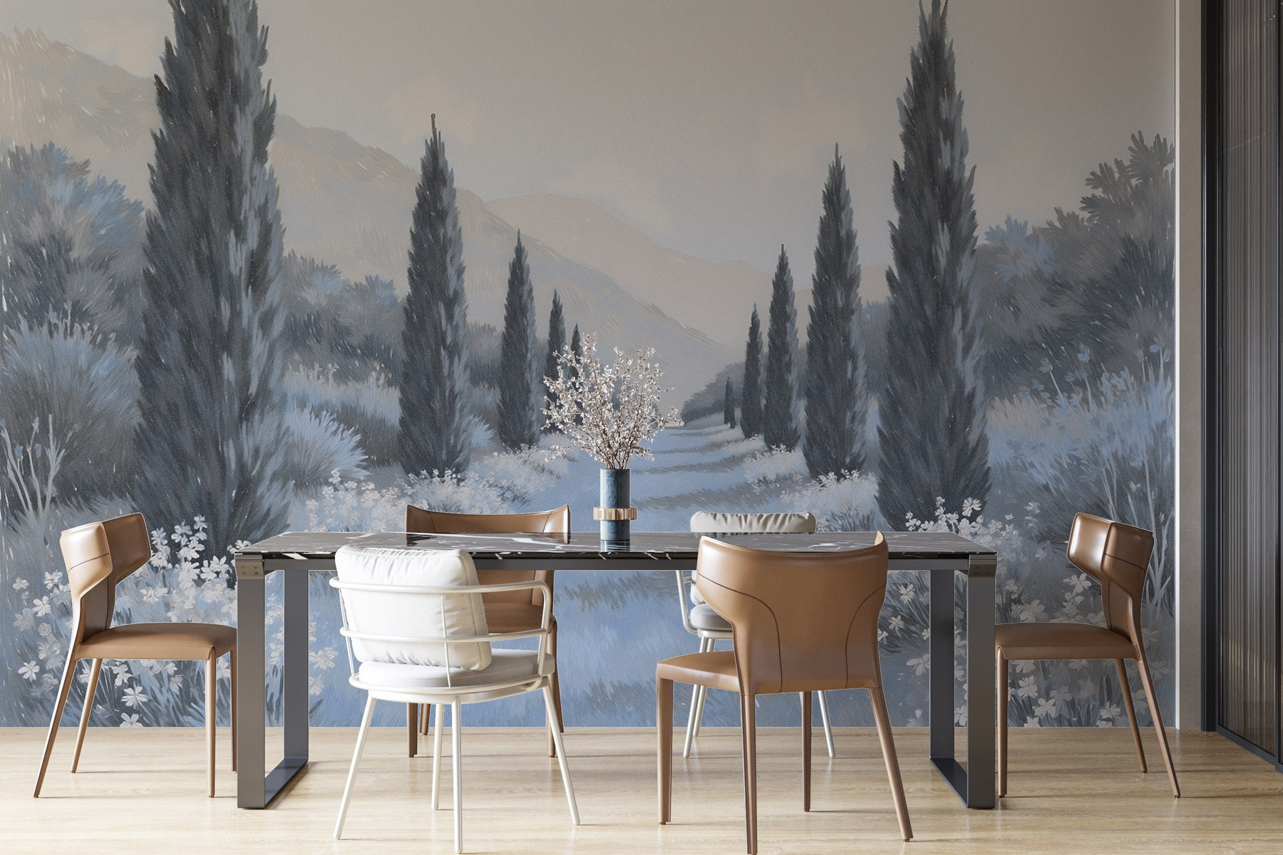 Transformeer je ruimte met deze fascinerende muurschildering, “Landschap met bomen en bloemen”. Stel je een sereen pad voor met hoge cipressen en delicate bloemen die de geheimen van de natuur fluisteren. De zachte tinten creëren een rustgevende sfeer, perfect om tot rust te komen na een lange dag. Het is alsof je frisse lucht binnenhaalt – zonder de insecten!
