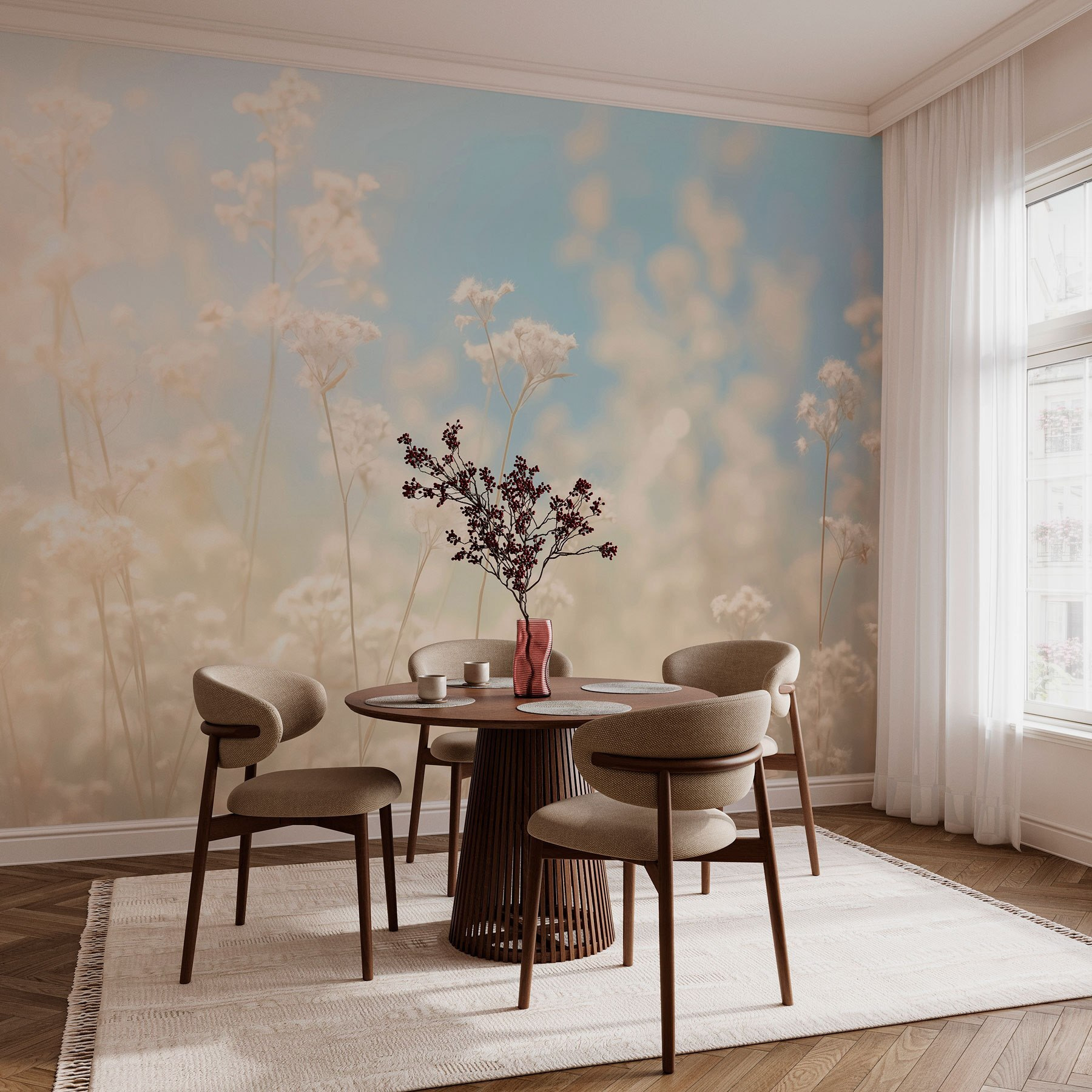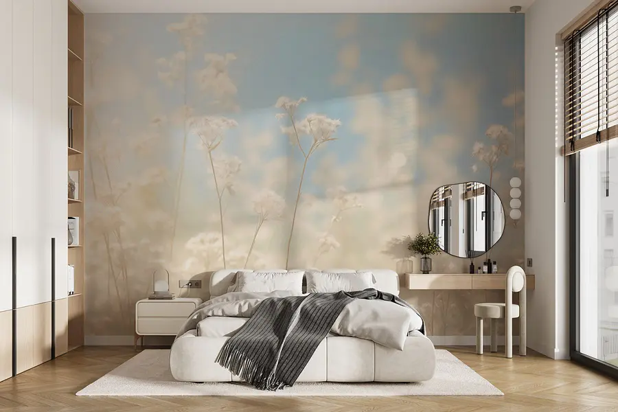 Verander elke kamer in een serene ontsnapping met de muurschildering “Delicate Blooms in Dreamy Light”. Stel je voor dat je een ruimte binnenloopt waar zachte bloemen zachtjes dansen in een warme gloed en de natuur naar binnen halen – over stemmingverhogend gesproken! De dromerige sfeer van deze muurschildering geeft het hele jaar door een lentegevoel. Stel je voor: je drinkt thee omringd door deze vredige achtergrond en je voelt je zorgen gewoon wegdrijven. Elke blik doet denken aan een luie namiddag in een zonovergoten tuin en nodigt uit tot een gevoel van kalmte en rust. Het is perfect om een vleugje natuurlijke charme toe te voegen aan woon- of slaapkamers. Een heerlijk toevluchtsoord wacht op je!