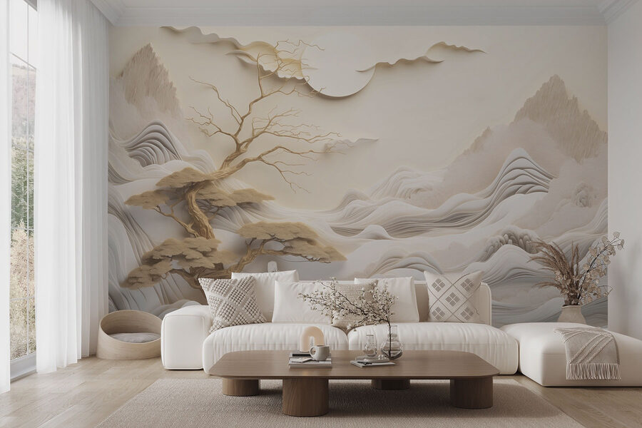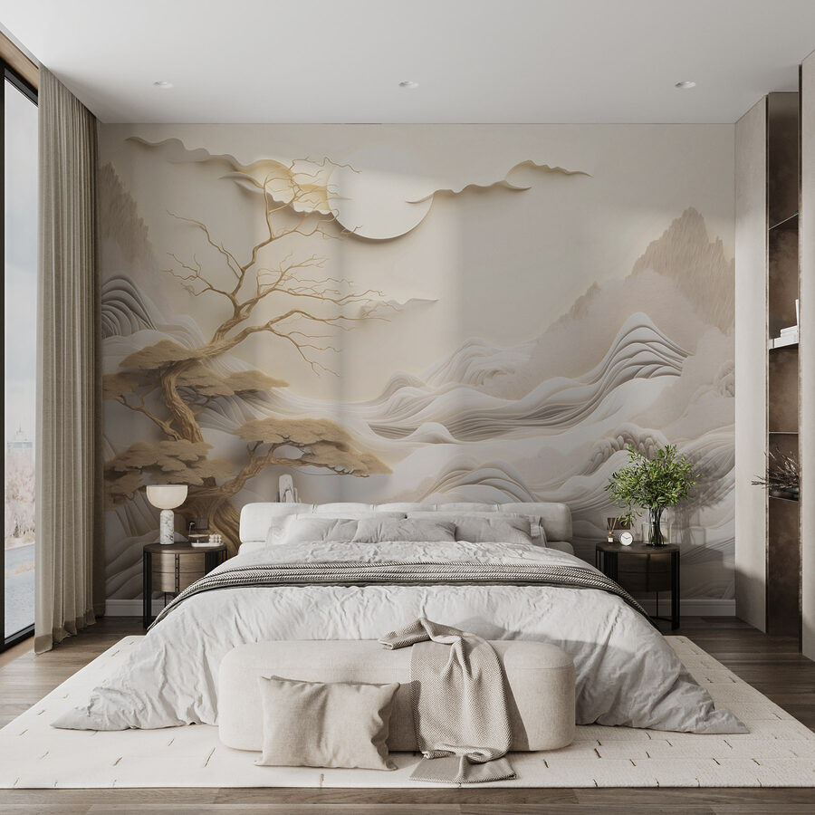 Tover elke kamer om in een rustige ontsnapping met deze prachtige muurschildering met een boom, bergen, wolken en een grote zon. Het is alsof je een sereen uitzicht op de bergen naar binnen haalt, zonder dat je een wandeling hoeft te maken. Stel je voor dat je koffie drinkt terwijl je geniet van de zachte gloed van de zon die door de bergen schijnt. Perfect voor een woonkamer of een gezellig leeshoekje, het is een conversatiestarter die gasten zal laten nadenken over de mysteries van het leven. Bovendien creëren de gedempte tinten een kalme sfeer, waardoor het gemakkelijk is om te ontspannen – wie wil er nu niet een beetje omhelzing door de natuur? Eerlijk gezegd is deze muurschildering de beste achtergrond voor luie zondagen of spontane dansfeestjes.