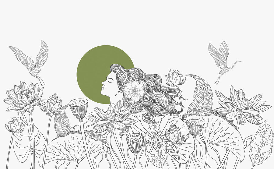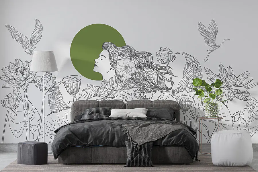 Stel je voor dat je muren tot leven komen met zwevende bloesems en zachte vogels. Er is zelfs een rustig gezicht dat alle serene vibes lijkt op te nemen. Of het nu voor een leeshoek of een zen-meditatieruimte is, deze muurschildering fluistert zachtjes kalmte en creativiteit in elke kamer. Het is modern en toch grillig-je zou jezelf wel eens in dagdromen kunnen verliezen, terwijl je kijkt naar de delicate lijnen en zachte tinten die door de kamer dansen.