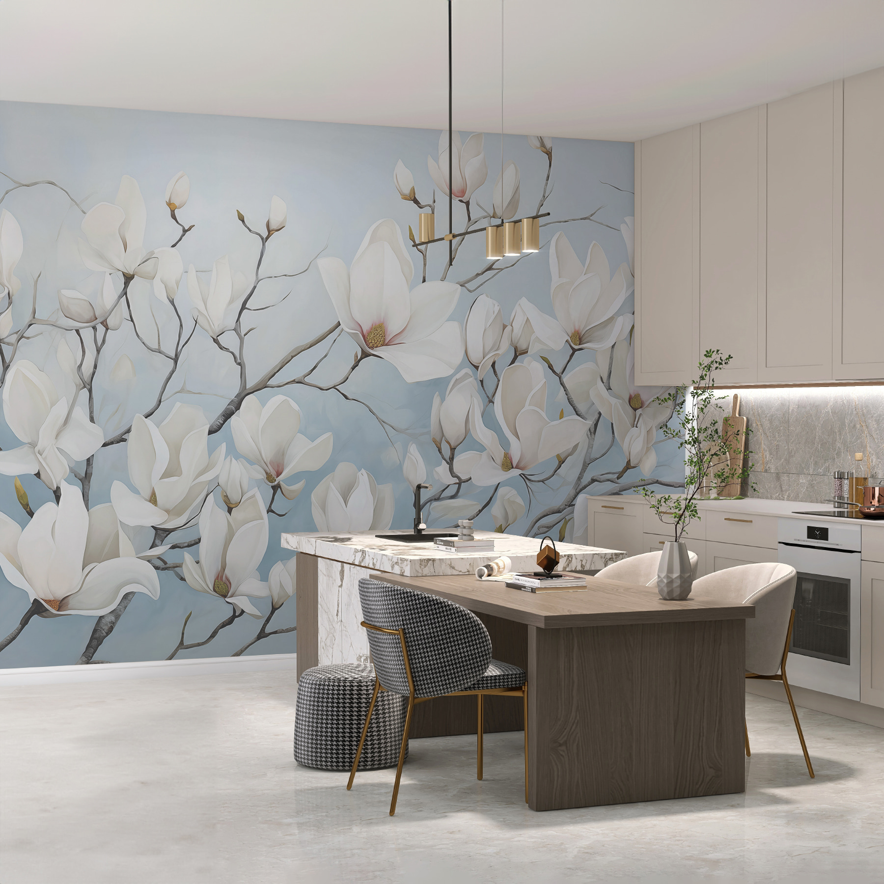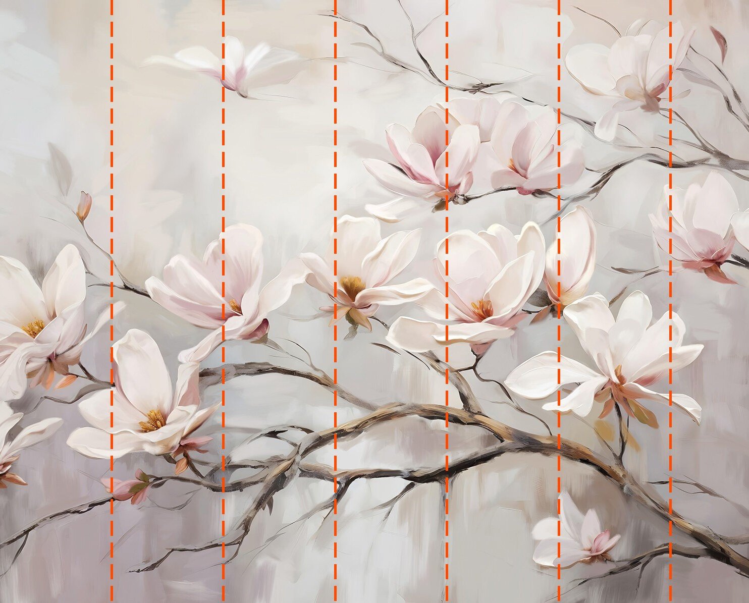 “Muurschilderingen w08125” is alsof je een stukje eeuwige lente in je woonkamer hebt. Stel je voor dat je elke dag wakker wordt met die dromerige werveling van magnolia’s – die tere bloemblaadjes in zacht wit en crèmekleurig roze tegen een serene achtergrond. Het is bijna alsof je een bloeiende tuin binnenstapt waar elke tak en bloesem uitnodigt tot rust en een vleugje eigenzinnigheid.
