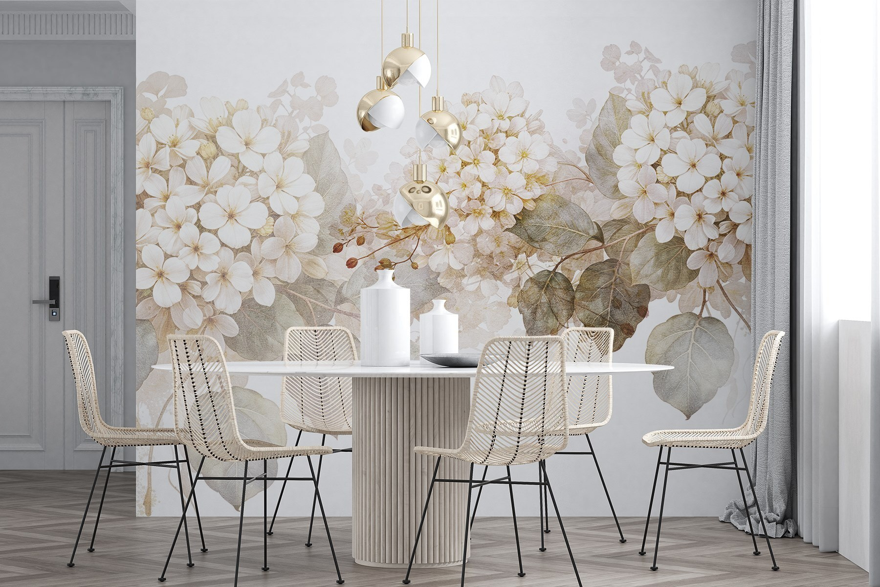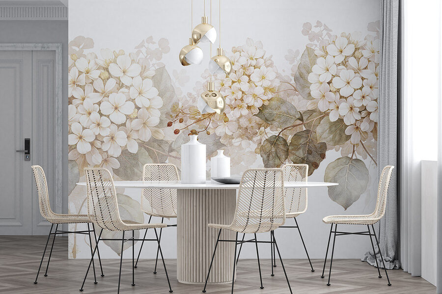 Transformeer je kamer met de serene schoonheid van “Serene Bloesems in Zachte Tinten”. Deze muurschildering is alsof je je kamer omhult met een zachte knuffel van de natuur. Stel je voor dat je wakker wordt met een zachte waterval van delicate bloesems die “kalmte” fluisteren telkens als je langsloopt. De mix van gedempte kleuren voelt als een frisse wind, die de chaos van het dagelijks leven verzacht. Perfect voor een gezellige woonkamer of een oase van rust in de slaapkamer, het nodigt uit tot warmte en rust. Bovendien is het moeilijk om niet te glimlachen als je begroet wordt door zulke mooie bloemen. Wie wil er nou geen bloeiende muren?