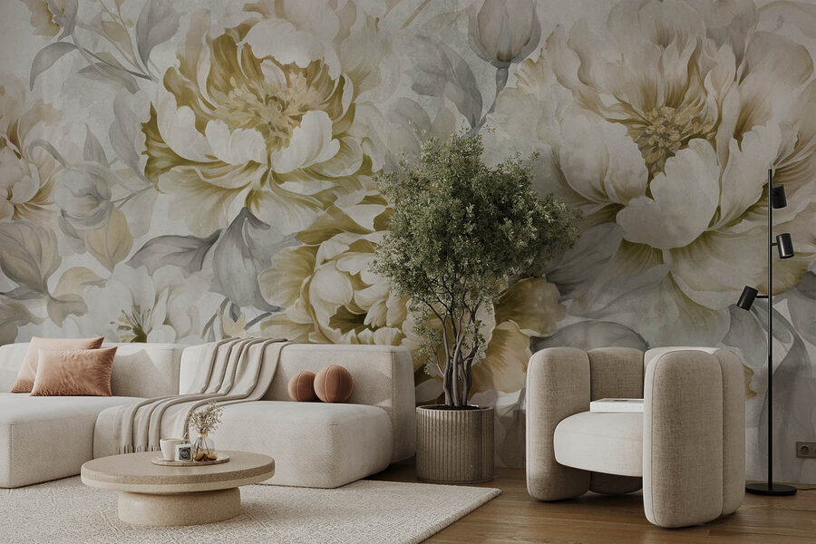 Verander elke ruimte in een rustig toevluchtsoord met de muurschildering “Delicate Blooms in Soft Hues”. Stel je voor dat je een serene tuin binnenstapt, waar zachte pioenrozen en rozen zoete woordjes fluisteren. De zachte kleuren mengen prachtig en creëren een sfeer die zowel gezellig als verfrissend aanvoelt, zoals je favoriete thee op een luie middag.