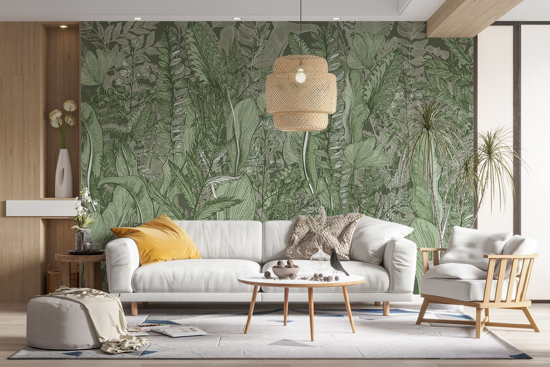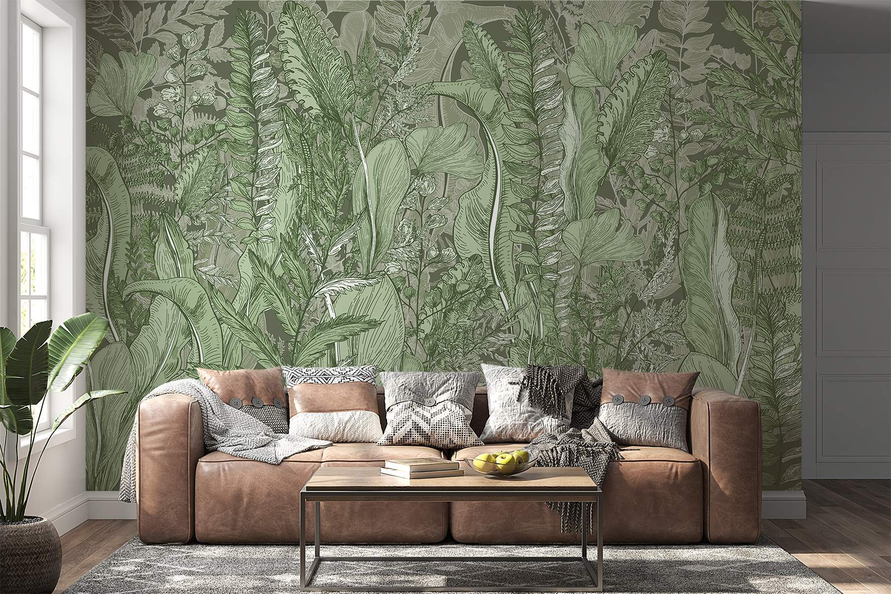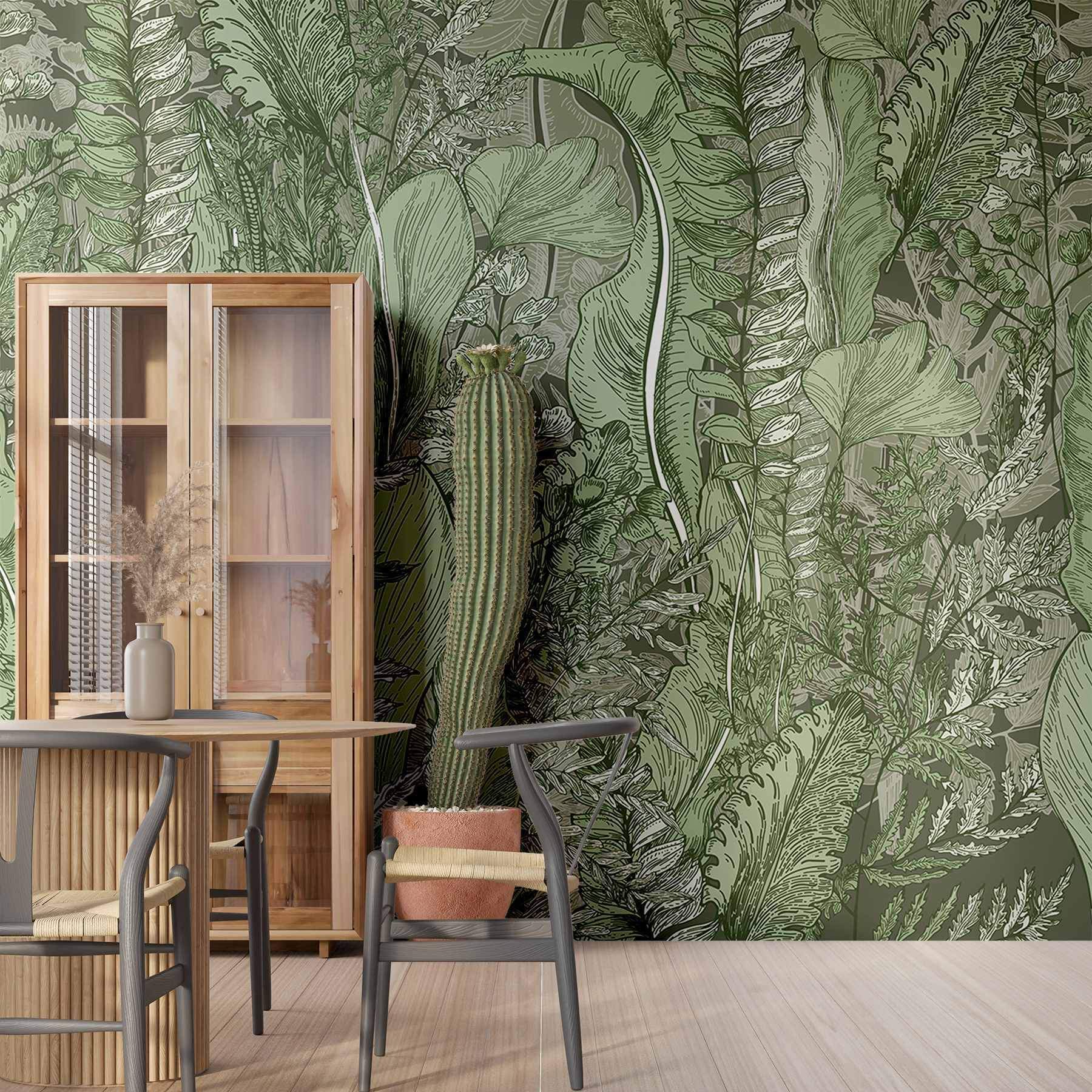 Tover elke ruimte om in een serene oase met de muurschildering “Lush Greenery”. Het is alsof je een wandeling maakt door een levendig bos zonder je kamer te verlaten! Vol met ingewikkelde bladeren en delicate varens, nodigt dit kunstwerk een vleugje natuur uit binnenshuis. Stel je voor dat je lekker gaat zitten met een goed boek, omringd door dit rustgevende groen – perfect om te dagdromen of tot rust te komen na een lange dag. Bovendien is het een chique oplossing voor diegenen die moeite hebben met het in leven houden van kamerplanten (geen oordeel!). Laat de rustgevende tinten je muren leven inblazen en verhoog je decor moeiteloos.