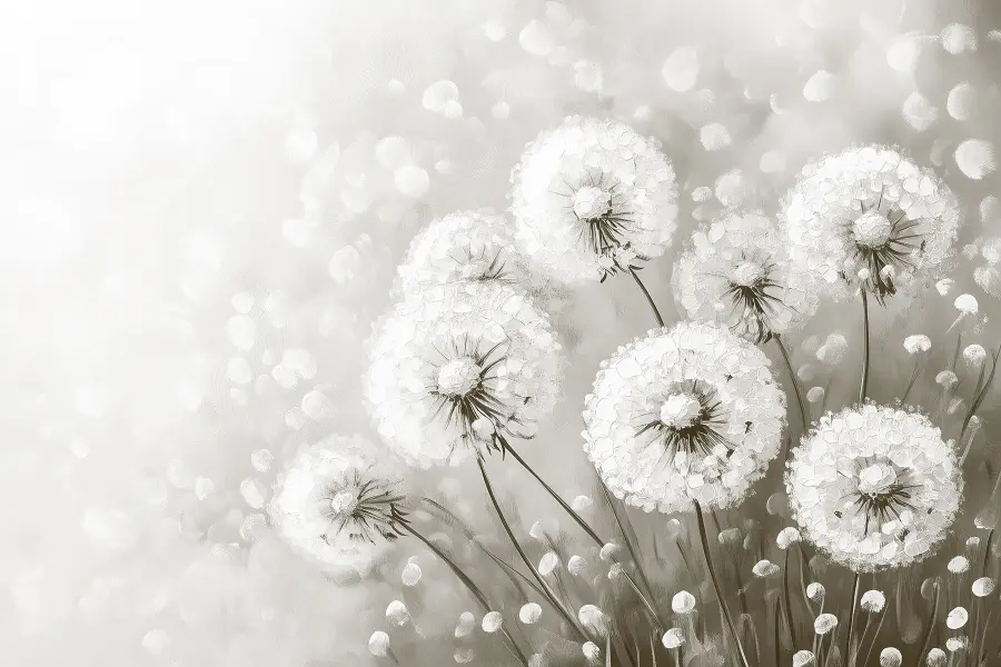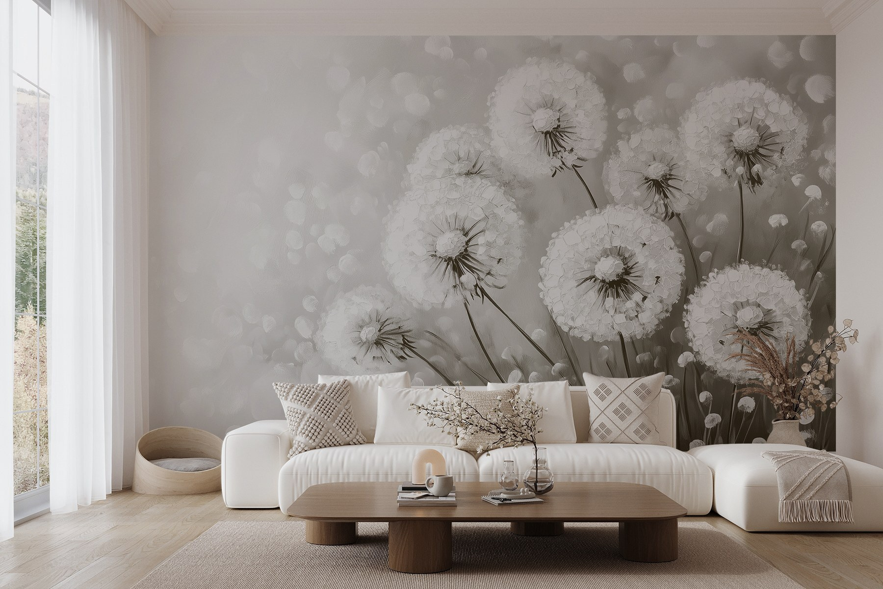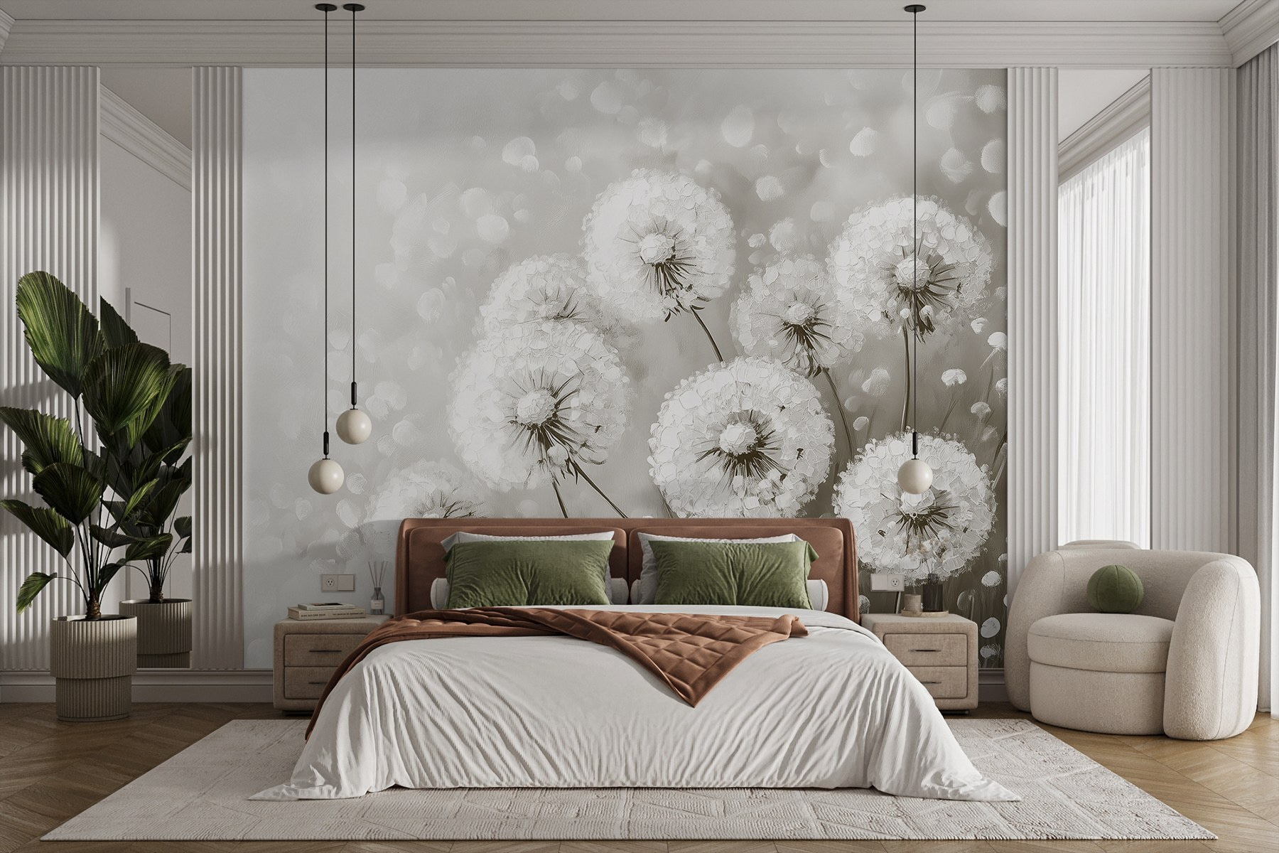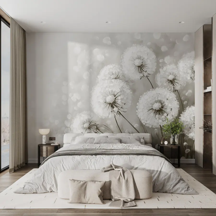 Transformeer je ruimte met deze betoverende muurschildering van paardenbloemen, zacht verlicht en vol met delicate witte bloemen. Het is alsof je een frisse wind binnenlaat – perfect om te dagdromen of thee te drinken terwijl je de wereld voorbij ziet gaan. Stel je die pluizige hoofdjes voor die dansen in de wind en je doen denken aan de magie van je kindertijd toen het blazen van die zaadjes een mini-avontuur was. De zachte tinten creëren een rustgevende sfeer, waardoor elke kamer vredig en uitnodigend aanvoelt. Het is niet zomaar decoratie; het is een stukje van het buitenleven dat verhalen uit de natuur op je muren fluistert. Perfect voor iedereen die houdt van een vleugje eigenzinnigheid in huis!