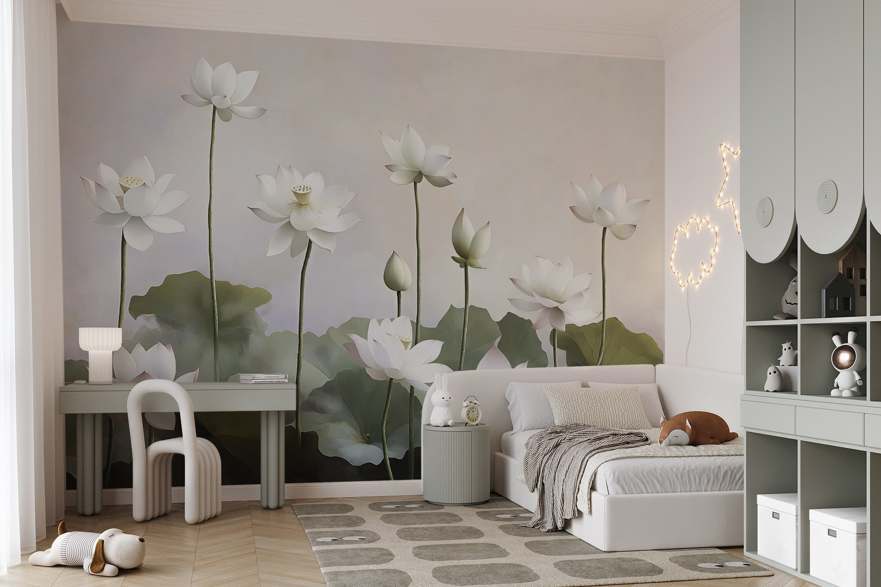 Stap in een wereld van rust met de muurschildering “Group of White Flowers”. Stel je voor dat je ruimte ineens helderder en uitnodigender is als deze elegante bloemen op de muur wuiven alsof ze dansen in een zacht briesje. Elk bloemblaadje fluistert vrede en als je er alleen al naar kijkt, vergeet je de drukte van alledag, alsof je een vredig hoekje vindt in een drukke tuin. Het is perfect voor elke kamer en verandert saaie muren in een serene ontsnapping. Vrienden zullen misschien wel opmerken hoe het de kamer doet aanvoelen als een rustig toevluchtsoord. Wie wil er nu geen stukje natuur binnenshuis?