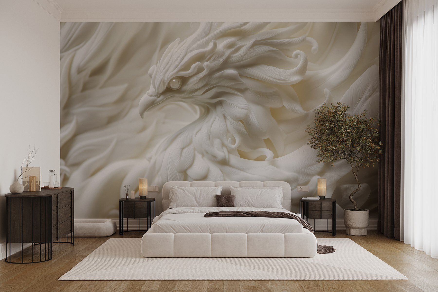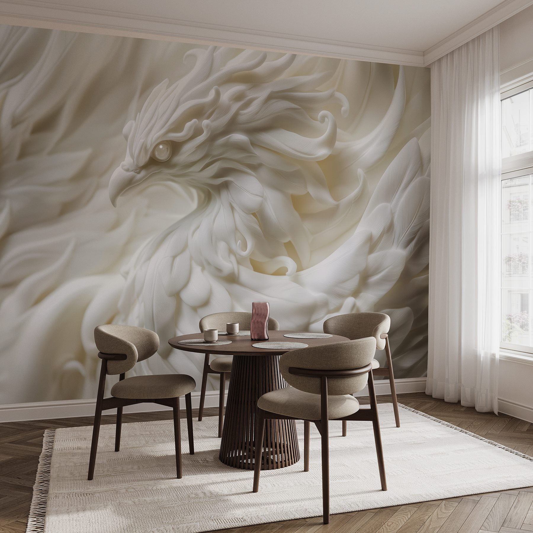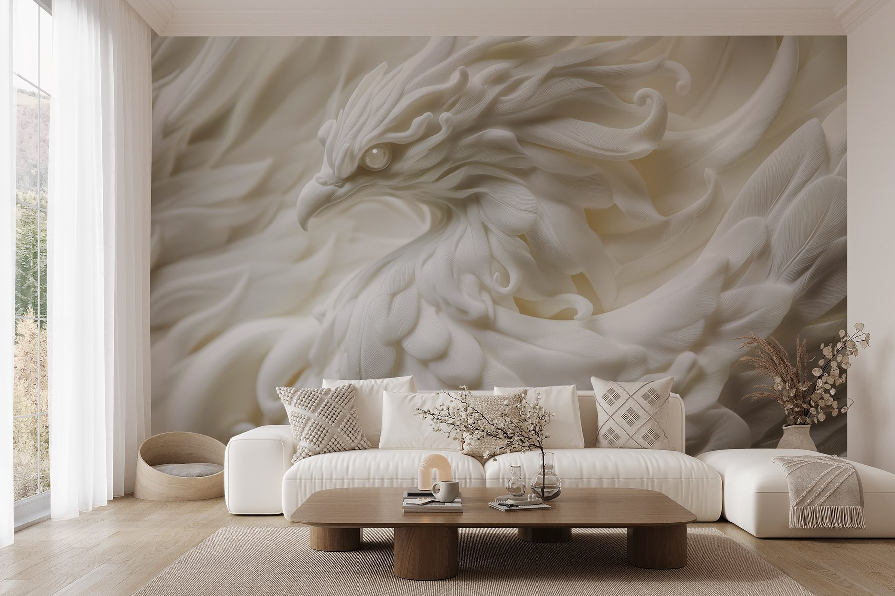 Transformeer je ruimte met de betoverende “Fotobehang White Bird Statue with Feathers”. Dit prachtige stuk brengt een zachte, serene sfeer die aanvoelt als een zacht briesje op een lentedag. Stel je voor: je zit aan de thee en de sierlijke details van de vogel spreken tot de verbeelding en nodigen je uit om even te genieten. De delicate textuur en het delicate wit creëren een sfeer die zowel rustgevend als verkwikkend is. Het is alsof je een stukje natuur aan je muur hebt hangen, dat bij elke blik rust en elegantie uitstraalt. Deze muurschildering decoreert niet alleen, maar inspireert ook. Of het nu in een gezellig leeshoekje is of in een levendige woonkamer, het zal zeker gesprekken opwekken en harten verwarmen. Creëer een klein toevluchtsoord – want wie houdt er nu niet van een nestje stijl in huis?