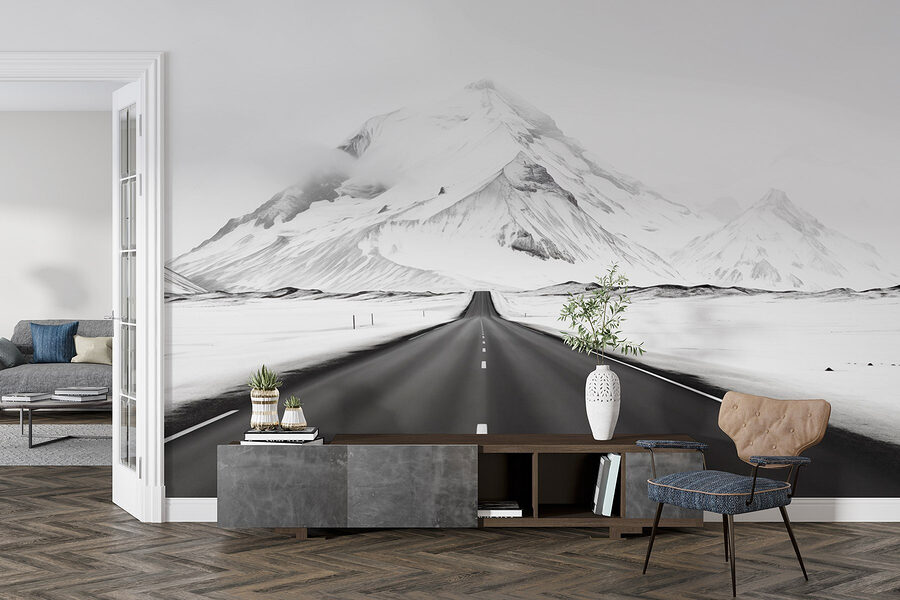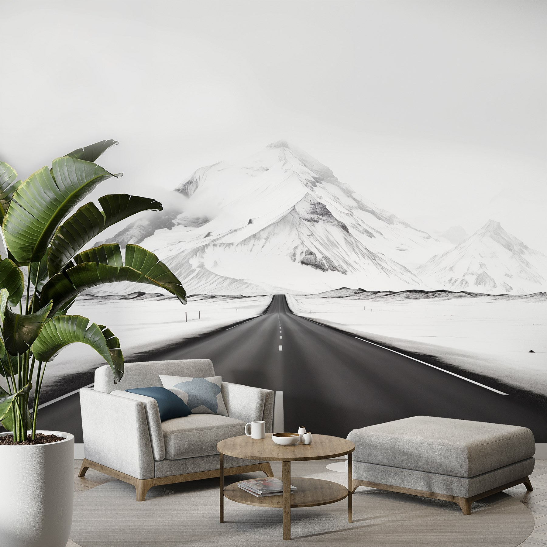 Tover elke kamer om in een winterlandschap met deze prachtige muurschildering. Stel je een uitgestrekte, open weg voor die zich uitstrekt naar majestueuze besneeuwde bergen, die je uitnodigen om het buitenleven te verkennen. De koele tinten trekken je naar binnen, waardoor elke ruimte fris en uitnodigend aanvoelt. Stel je voor dat je lekker knus gaat zitten met een warm drankje, naar dit serene uitzicht staart en die vredige kilte in de lucht voelt, zelfs als je lekker binnen zit. Het is alsof je een stukje avontuur aan je muur hebt hangen, dat je inspireert tot dagdromen over spontane roadtrips en ijzige wandelingen. Perfect voor natuurliefhebbers of iedereen die een vleugje rust aan zijn interieur wil toevoegen!
