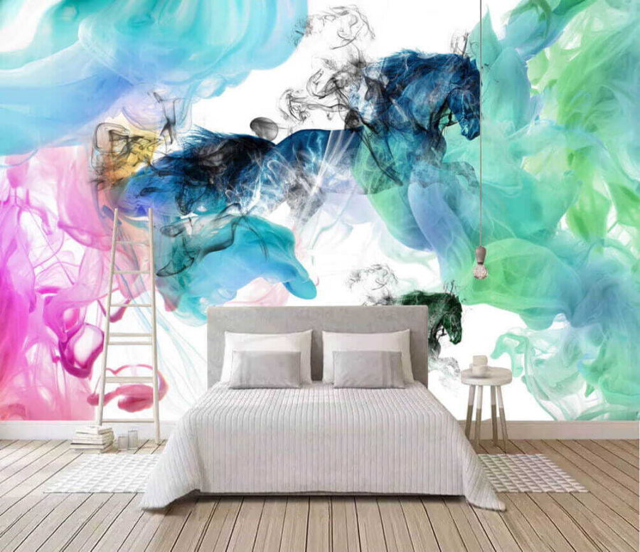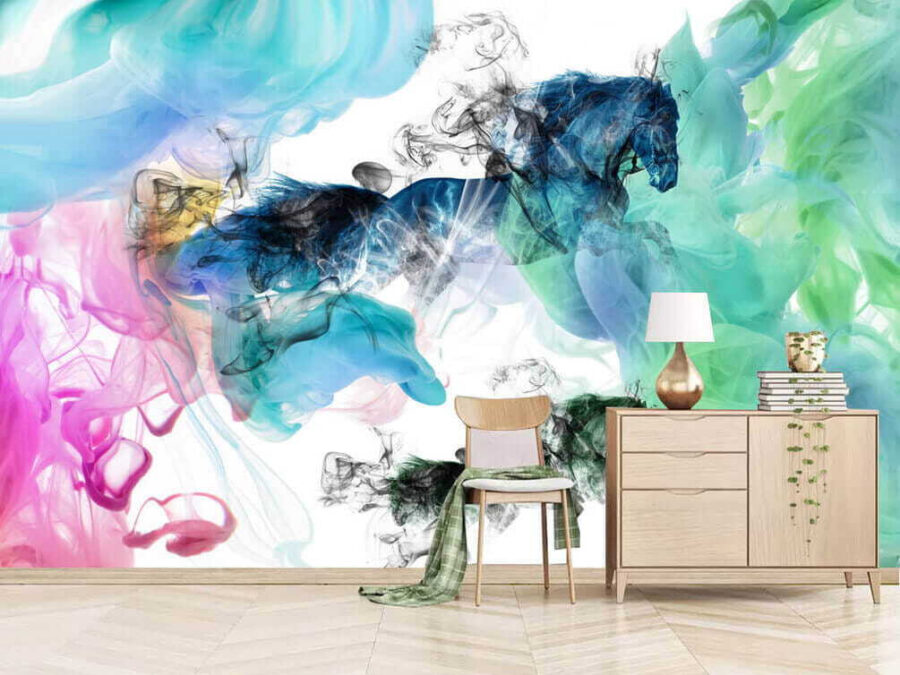 Transformeer elke ruimte met deze fascinerende muurschildering van paarden die door kleurrijke rookwolken dansen. Het is als een wilde dagdroom waar kunst en verbeelding botsen. De levendige tinten – denk aan blauw gemengd met speels roze – brengen energie en charme, waardoor het zeker een gespreksstarter wordt. Zie het al voor je in een gezellig leeshoekje of een opvallende muur. Misschien inspireert het wel tot een geïmproviseerd dansfeest of rustige avonden met een boek en een kopje thee. Met elke blik die je erop werpt, voel je je een beetje levendiger, alsof er een frisse wind waait in je huis. En wie houdt er niet van een paard dat door een kleurrijke wolk galoppeert? Dat is pas een vibe!