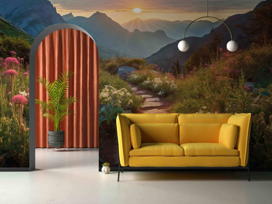 Ontdek de dagelijkse sereniteit met onze muurschildering “Mountain Trail at Sunrise”. Deze muurschildering legt perfect dat vredige moment vast waarop de zon haar opgang begint en warme stralen werpt over een rustig bergpad vol wilde bloemen. Kun je het zachte ruisen van de ochtendbries bijna horen? Deze muurschildering is ideaal voor natuurliefhebbers die hunkeren naar een vleugje buiten binnenshuis – ideaal om tot rust te komen na een lange dag. Stel je voor dat je van je ochtendkoffie geniet met zo’n prachtige achtergrond! Voel de frisse berglucht en laat dit adembenemende uitzicht elke kamer veranderen in een gezellig toevluchtsoord.