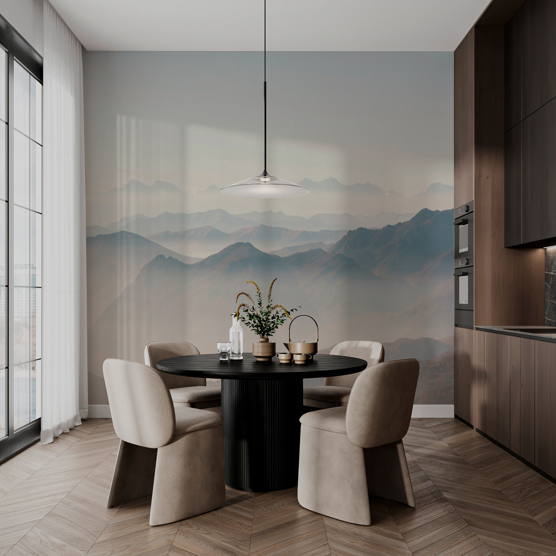 Verander elke ruimte in een serene ontsnapping met deze prachtige muurschildering van een bergketen gehuld in mist. Stel je voor dat je op een luie zondagochtend koffie drinkt terwijl je naar deze zachte, glooiende bergtoppen staart. Het is als een mini-vakantie voor de muren. De gedempte kleuren roepen een gevoel van rust op, perfect voor een gezellige woonkamer of een rustige slaapkamer. Stel je voor dat deze muurschildering een achtergrond creëert die dagdromen oproept over frisse lucht en bergwandelingen, zonder dat je wandelschoenen nodig hebt. Dit decor vertelt een verhaal en brengt de natuur binnen met een vleugje avontuur.