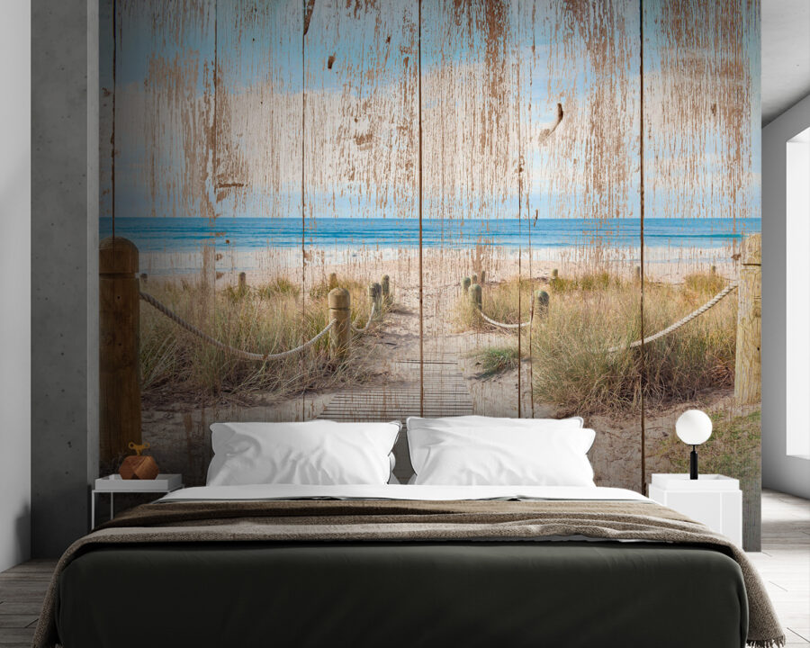 Stel je voor dat je een gezellig strandhuisje binnenstapt, ook al ben je gewoon thuis. Deze muurschildering, met dat charmante houten pad dat rechtstreeks naar de oceaan leidt, fluistert verhalen over luie zomers en zilte briesjes. Het is alsof je elke keer dat je ernaar kijkt een minivakantie beleeft, vind je niet? Het verweerde hout voegt een vleugje nostalgie toe, alsof het talloze zonsondergangen heeft gezien. Stel je voor dat je ‘s ochtends van je koffie nipt terwijl je naar die zachte golven staart. Wie weet inspireert het je wel tot een spontane strandtrip! Perfect voor elke liefhebber van de zee die een beetje rust, plezier en een vleugje avontuur in zijn of haar ruimte wil brengen.