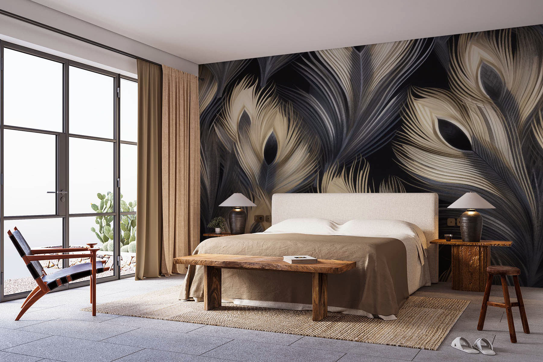 Transformeer uw ruimte met deze elegante muurschildering geïnspireerd op veren, het soort dat u even wilt laten stilstaan om te bewonderen, misschien zelfs uw ochtendkoffie ervoor wilt serveren! Het opvallende contrast van zachte beige tinten tegen diep zwart creëert een luxe sfeer die zowel rustgevend als stijlvol is. Stel je voor dat je een kamer binnenloopt en het gevoel hebt dat je in een chique toevluchtsoord bent. Perfect voor wie van de natuur houdt, maar ook een vleugje glamour wil. Het is alsof je een pauw uitnodigt voor je decoratiefeestje: fantastisch en net even onverwacht! Wie wil dat nou niet?