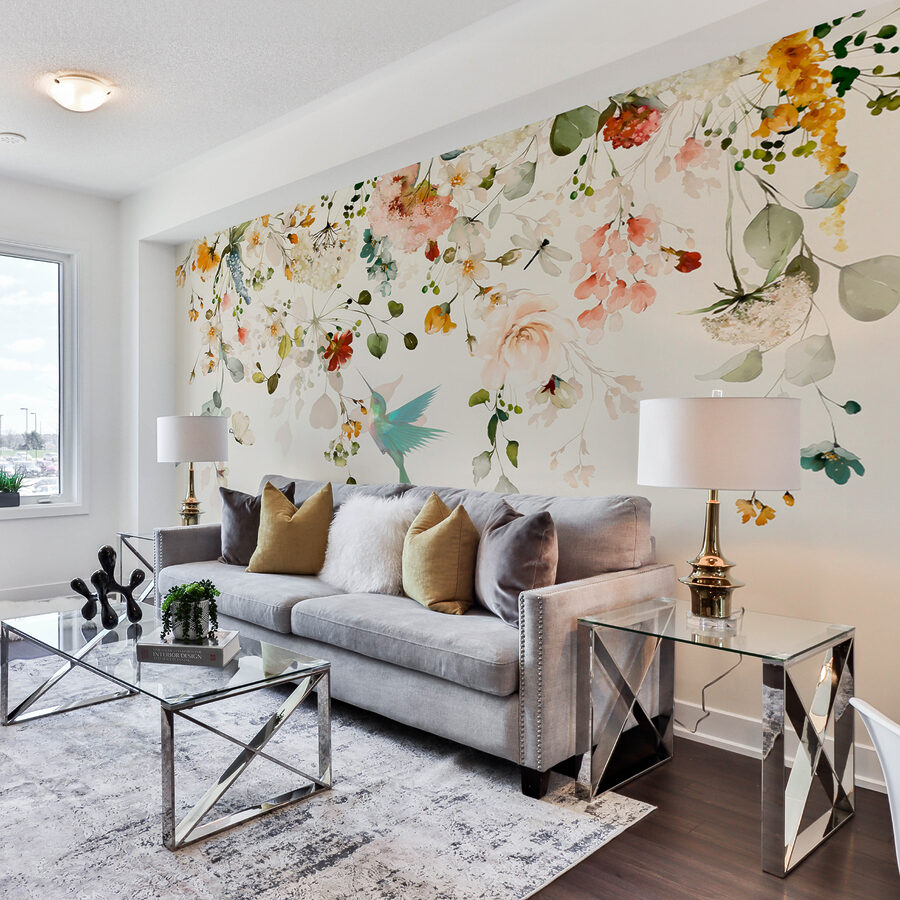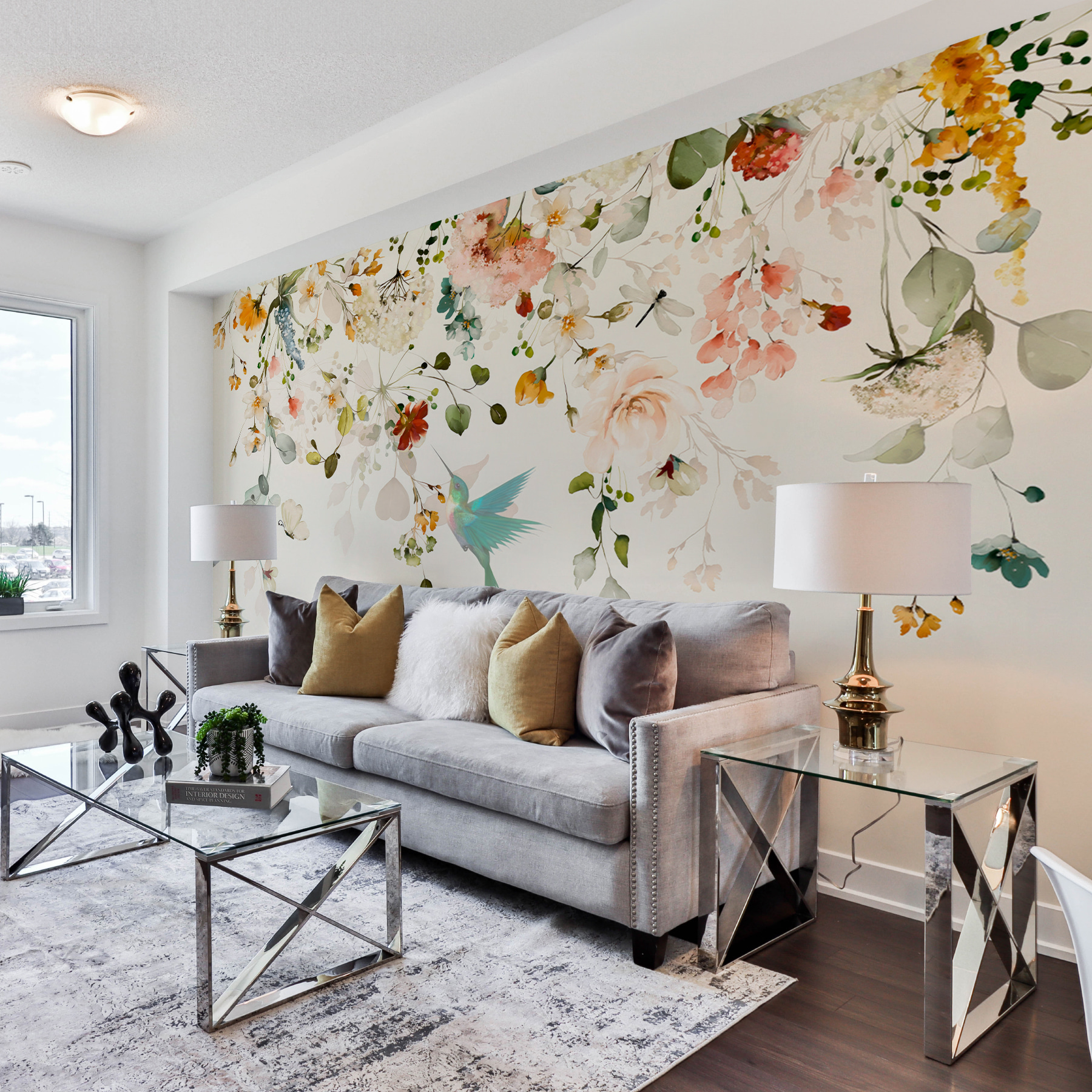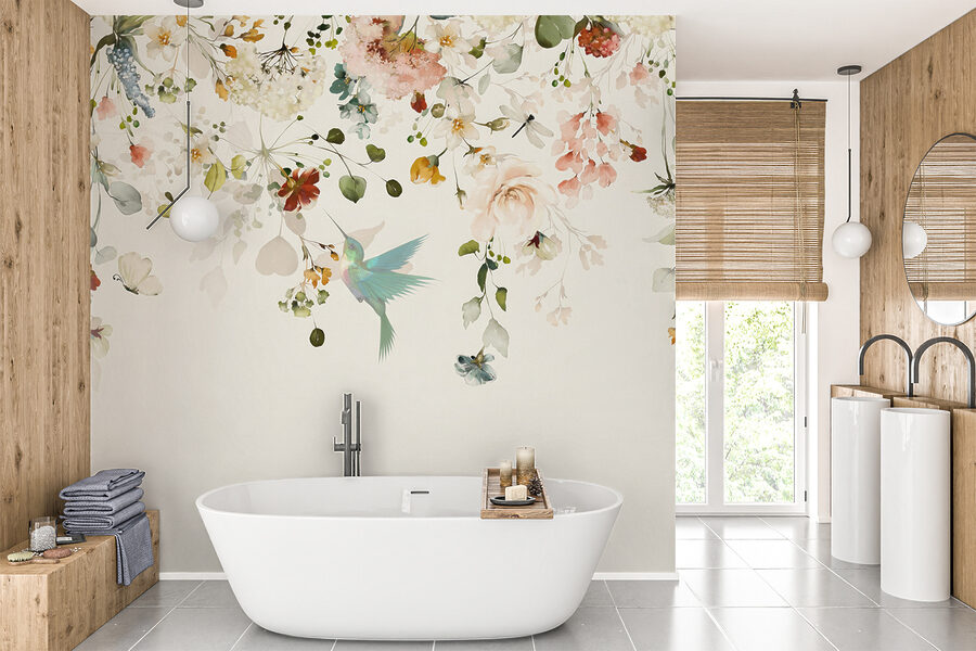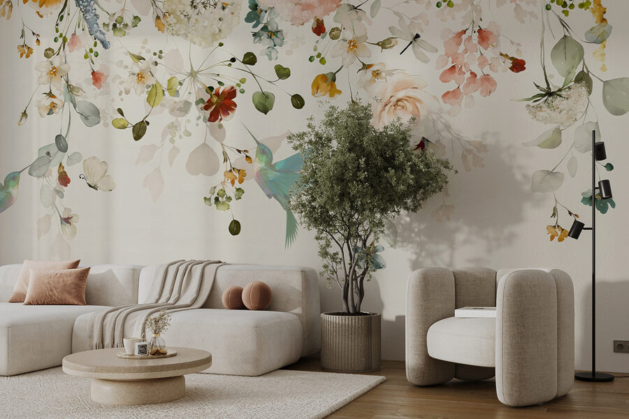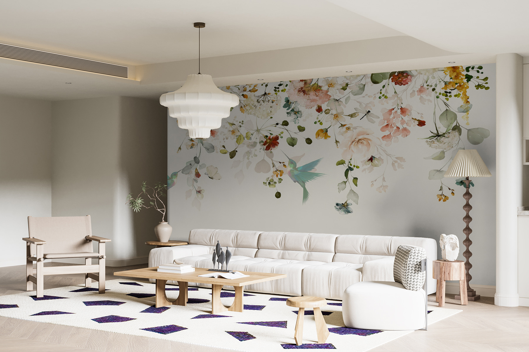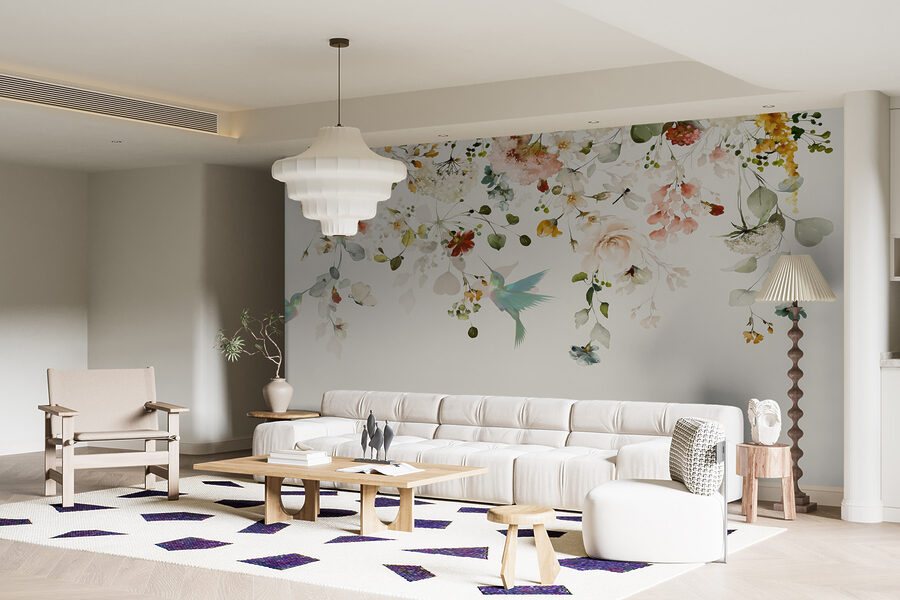 Deze muurschildering heeft een serene schoonheid die gewoon… rustgevend is. Die pasteltinten en ingewikkelde details? Ze geven je een knus en toch elegant gevoel. Plus, die kolibrie – zo schattig en grillig, toch? Het is bijna alsof je het gezoem van zijn kleine vleugels kunt horen. Of je je nu oprolt met een boek of een praatje maakt met vrienden, deze muurschildering zorgt voor een heerlijk rustige sfeer.