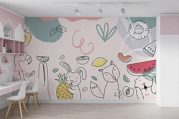 Fotobehang Behang met een bos van bomen en dieren