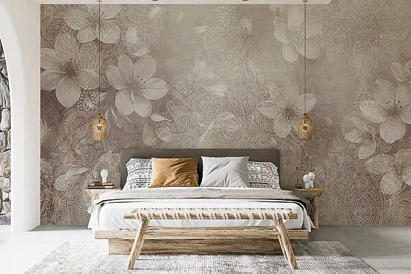 Fotobehang Witte en grijze achtergrond met witte en grijze bloemmotieven