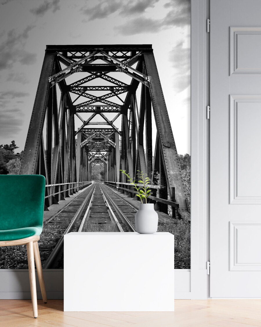 Transform your space with this stunning wall mural, “Train Tracks Going Through a Bridge.” Imagine stepping into a scene that feels both timeless and adventurous—a black-and-white masterpiece that draws you in like an old favorite book. It’s as if you’re standing on that bridge, feeling the gentle breeze and hearing the distant rumbling of a train. The intricate details of the steel framework invite curiosity and the sense of journey. This piece isn’t just decor; it’s a gateway to memories, stories, and dreams. Perfect for any room, it quietly sparks conversations and adds a unique touch. Who wouldn’t want to get lost in a mural like this?